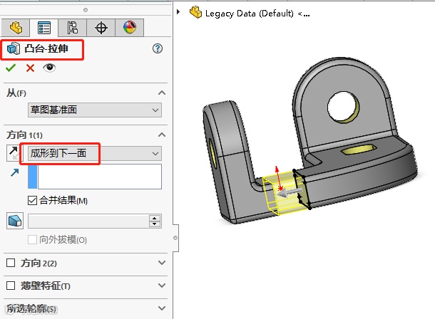 7、利用【拉伸凸台】命令桥接两实体的间隙:在后面实体的平面上绘制一个草图,单击【转换实体引用】,复制该面的边线,以【成形到下一面】为终止条件,拉伸草图,勾选【合并结果】。