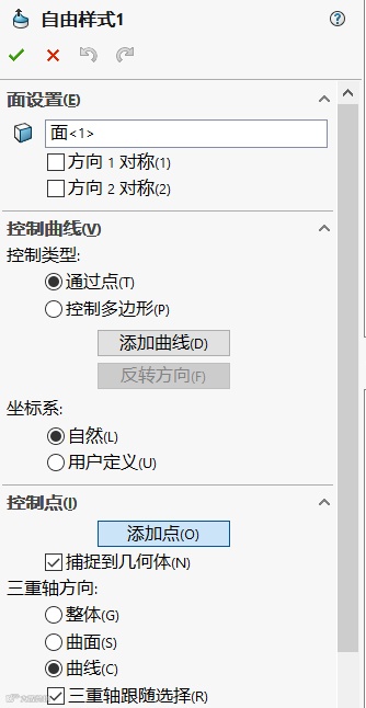 自由形功能允许用户在SOLIDWORKS中创建和编辑自由的、非参数化的三维曲线和曲面。这意味着用户可以摆脱传统的约束和参数限制,以更直观、更自由的方式塑造模型。点击菜单:【插入】/【特征】/【自由形】找到该命令。