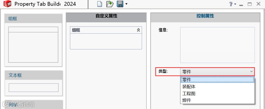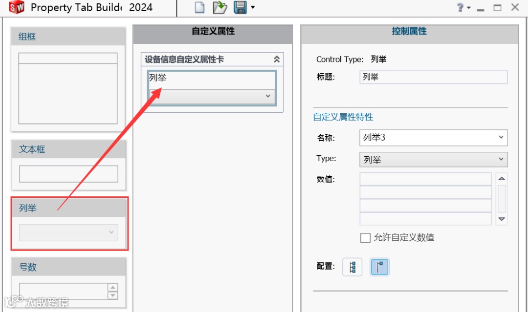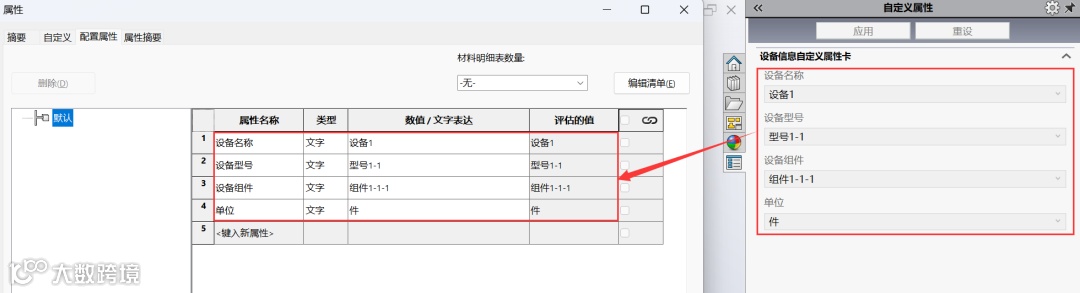配置,当前属性需要添加到SOLIDWORKS“自定义属性中”还是“配置属性”中,如下图中此属性则在应用后添加到“配置属性”中;