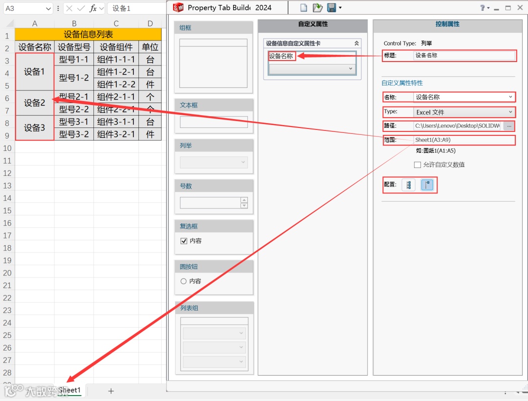范围,输入需要链接Excel文件的范围作为下拉项,如图中的范围“Sheet1(A3:A9)”则说明当前链接的是Excel文件中的“Sheer1”页工作表中的A3到A9表格数据;