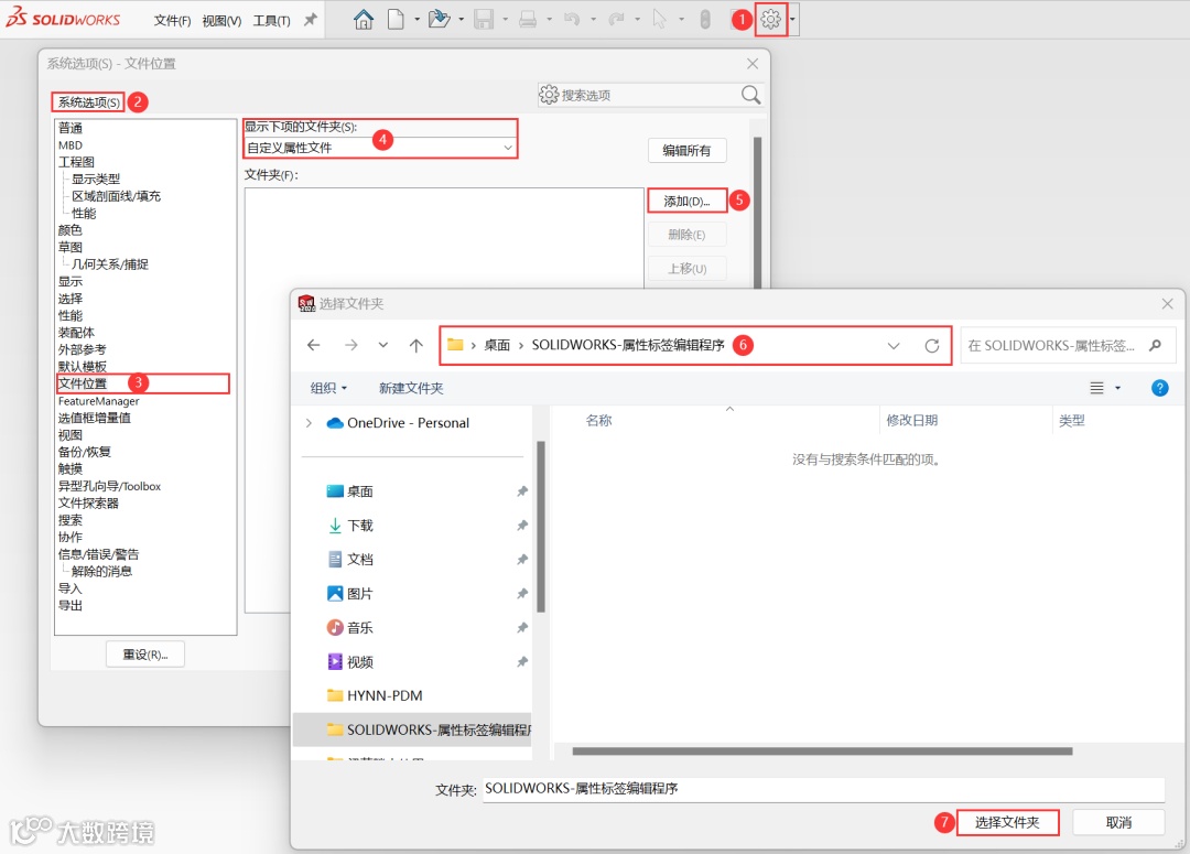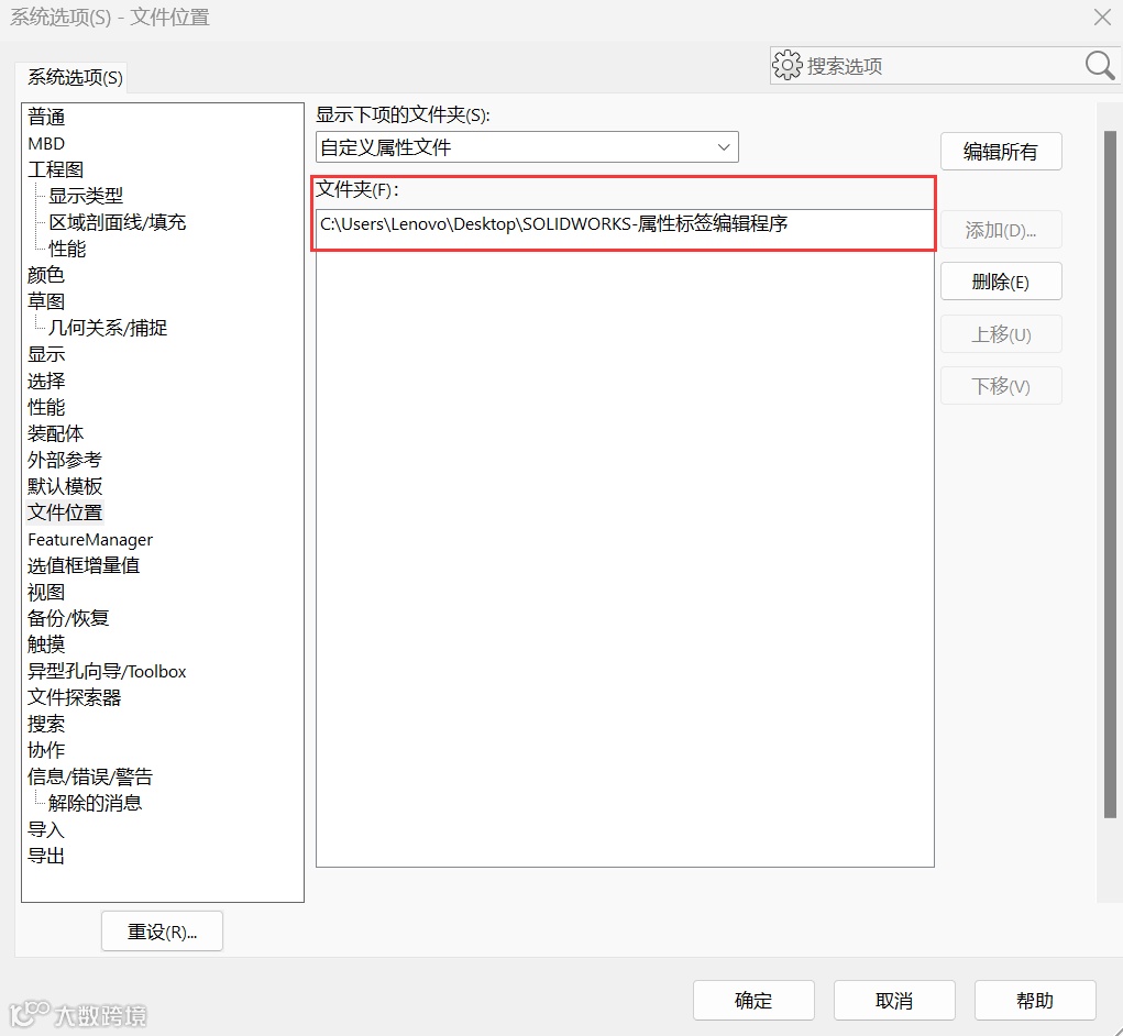 保存完成后设置调用的文件路径,在SOLIDWORKS中添加“自定义属性文件”, SOLIDWORKS选项→系统选项→文件位置→显示下项的文件夹→自定义属性文件→添加→浏览到存放自定义属性文件的文件夹目录→选择文件夹