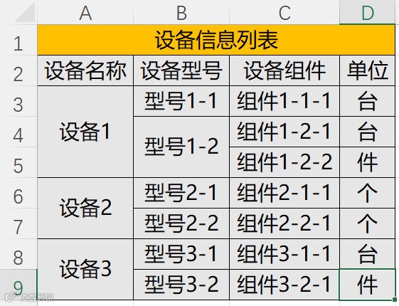 将企业对应的设备/产品信息,写进Excel中,如下图所示包含。“设备名称”中包含的“设备型号”,“设备型号”中包含的“设备组件”及单位。