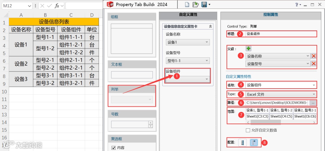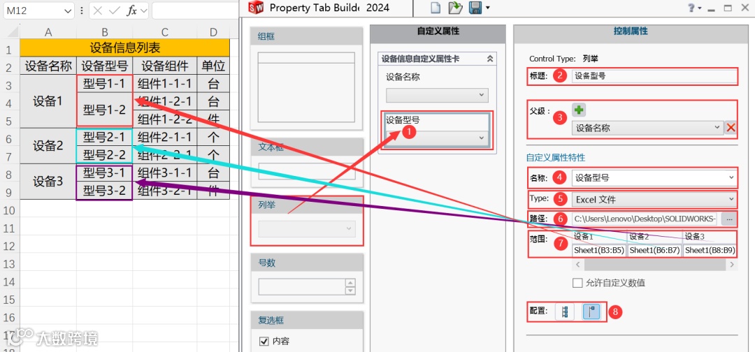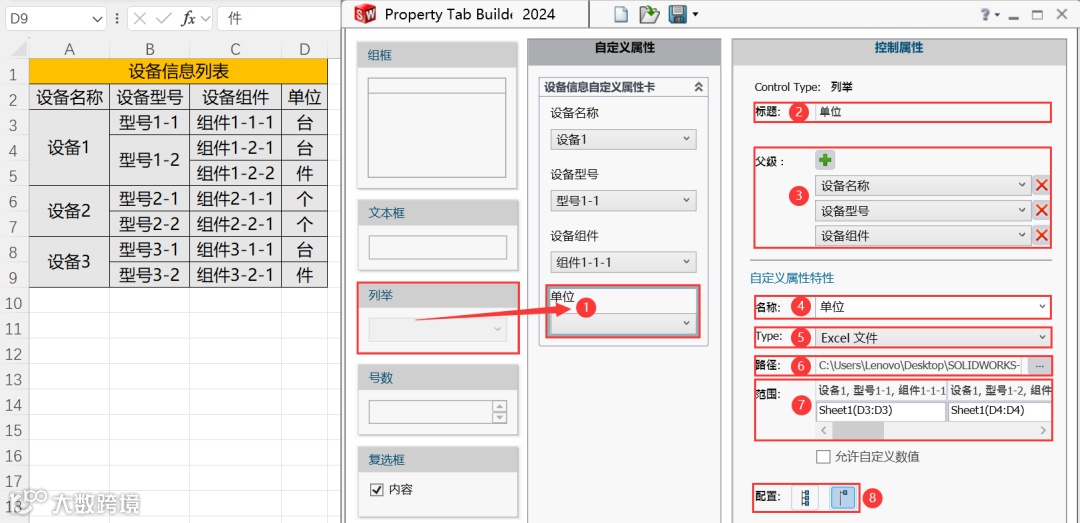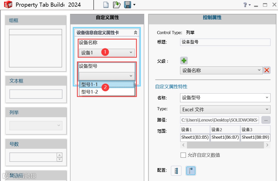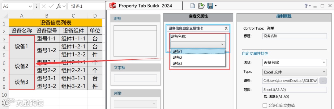 完成父级列举“设备名称”的设置后即可链接到Excel并获取到数值以供下拉选择。