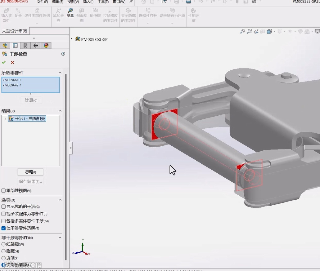 在SW 2025中,大型设计审阅模式新增干涉检查,可及时发现大型装配体中的干涉问题。