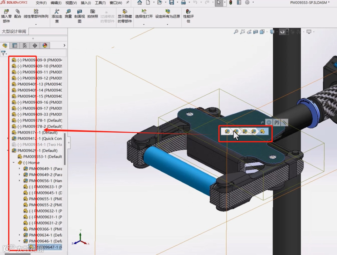 在SW2025中,大型设计审阅模式下也可以使用选择导览列了,处理大型装配体将变得更加高效。选择导览列可以帮助我们快速清晰地选择正确的装配体层级,我们可以对比下设计树中的子装配层级。