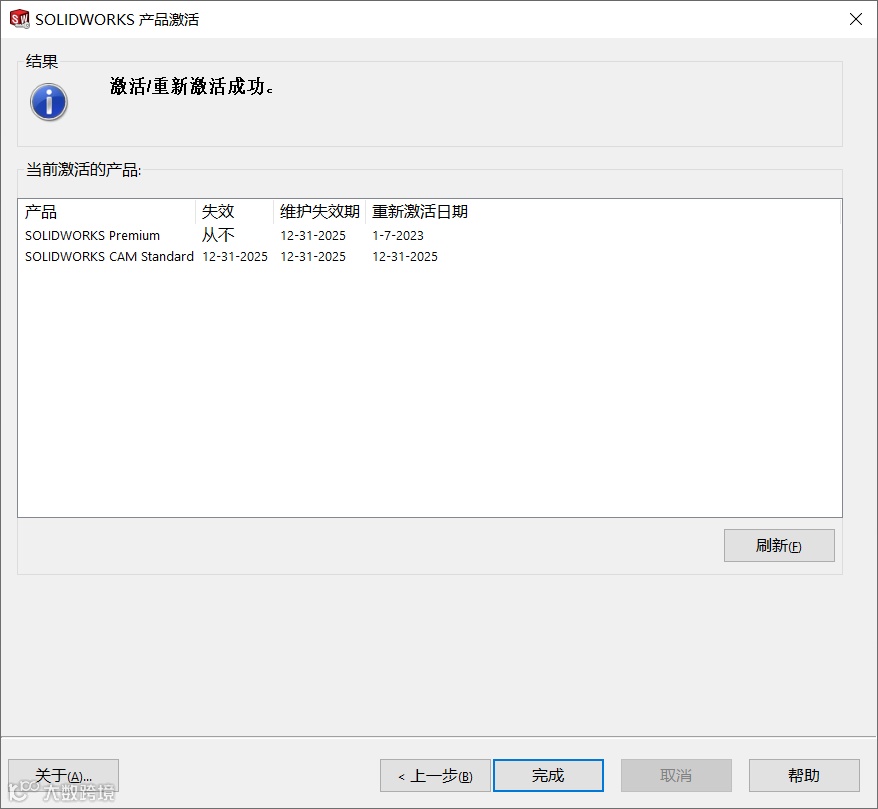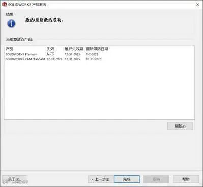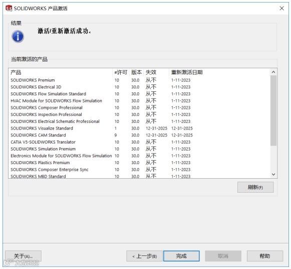 e、 单击“完成”完成激活,如下图所示。该序列号下所有产品许可重新激活。