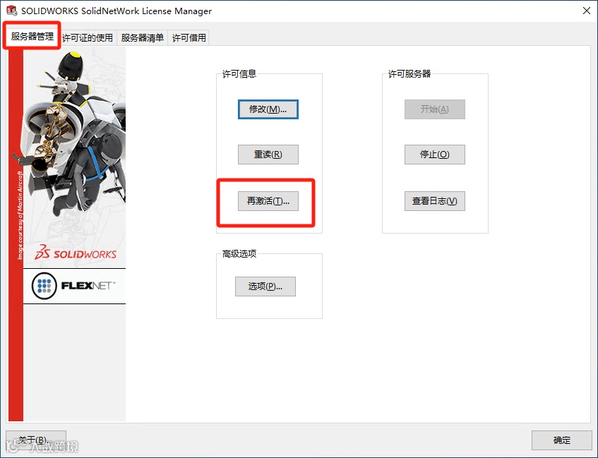 b、在SolidNetWork License Manager中,服务器管理选项卡中点击“再激活”,如图2-2所示