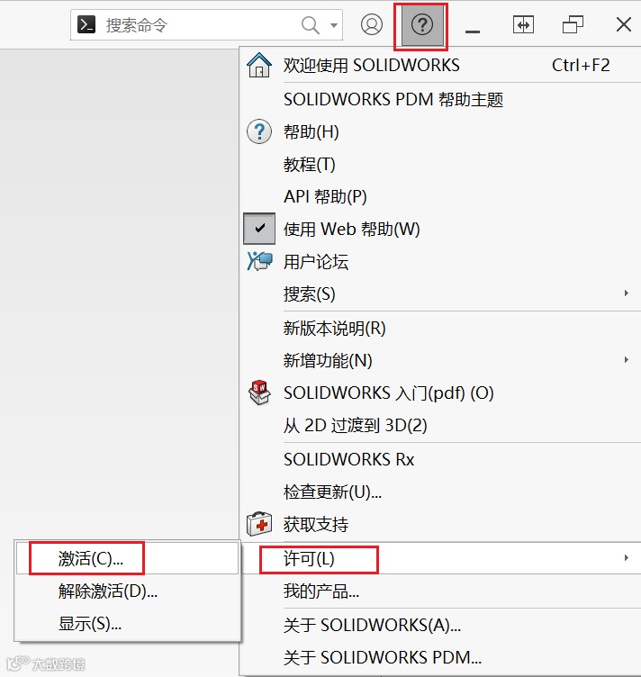 a、启动SOLIDWORKS软件,在右上角菜单栏中点击帮助——许可——激活