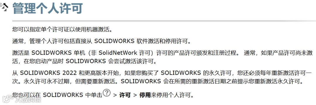 从 SOLIDWORKS 2022 产品开始,如果您拥有永久商业或教育许可,则必须每年重新激活这些许可一次。永久许可永不过期,但需要每年重新激活。SOLIDWORKS 产品激活会在所需的重新激活日期之前提示您重新激活。您只需要在提示日期前重新激活即可继续使用了。