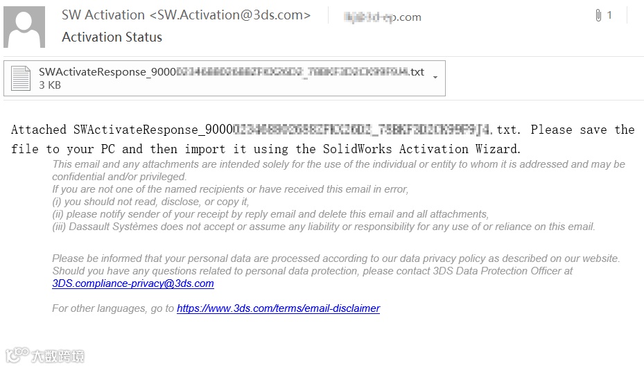 d、利用外网邮箱将SWActivateRequest文件以附件形式发送至邮箱activation@solidworks.com,稍等片刻会收到一封回信,附件是一个以SWActivateResponse_开头的txt文件,将该SWActivateResponse_文件拷贝到需要激活SOLIDWORKS电脑上