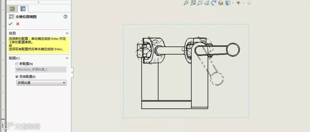 装配体交叉视图配置,可以实现在同一视图里表现产品的极限位置。