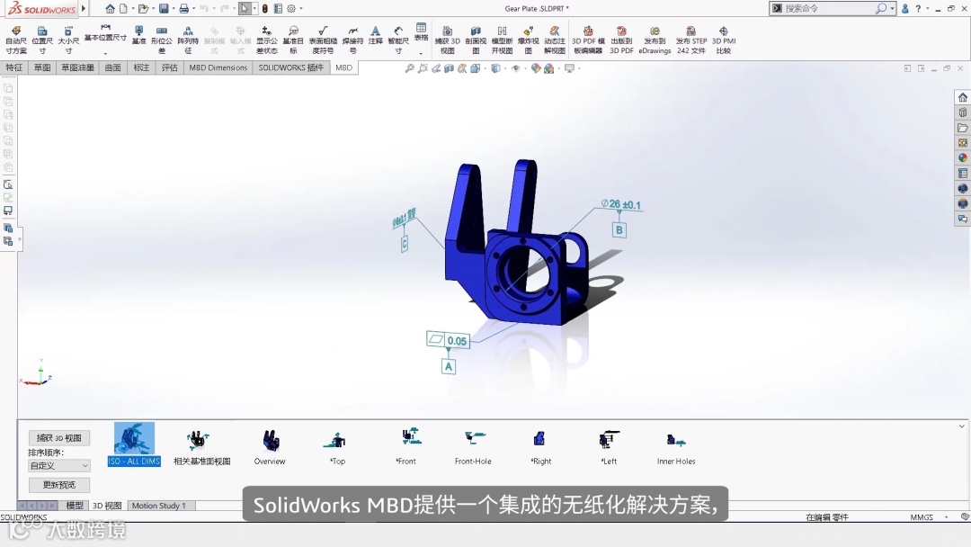 SOLIDWORKS MBD提供一个集成的无纸化解决方案,整理和发布3D产品的制造信息,使各个环节中的每一位工作人员都能正确理解设计意图。SOLIDWORKS MBD模型包含产品制造信息PIM,以此来表达产品的几何形状、尺寸、公差、基准、注释等GD&T信息。