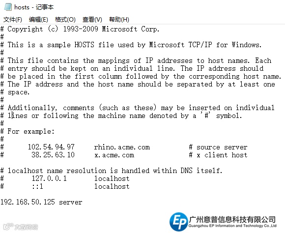 现在我们处理下通信不畅的问题,利用记事本打开客户端C:\Windows\System32\drivers\etc下的hosts文件,在末端加入一行“服务器IP + 空格 + 服务器名称”如图11所示
