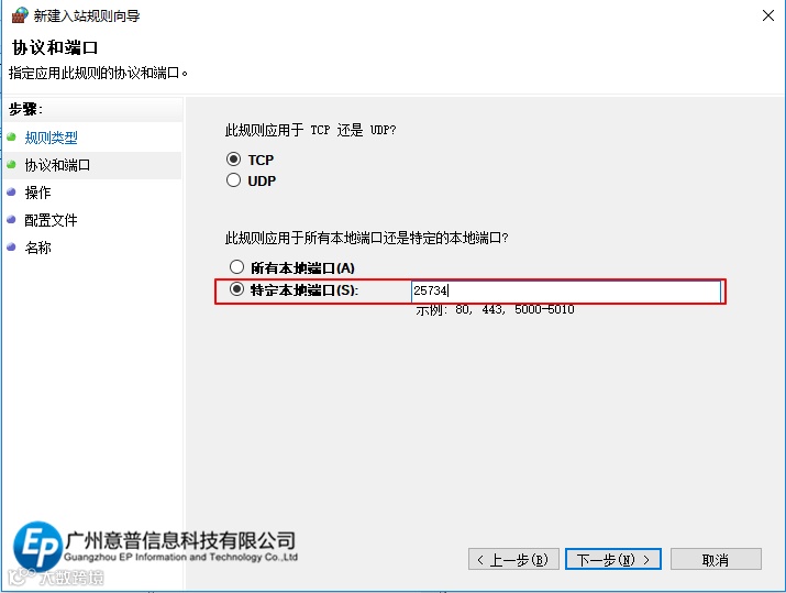 在“特定本地端口”下输入“25734”,点击“下一步”如图7所示。