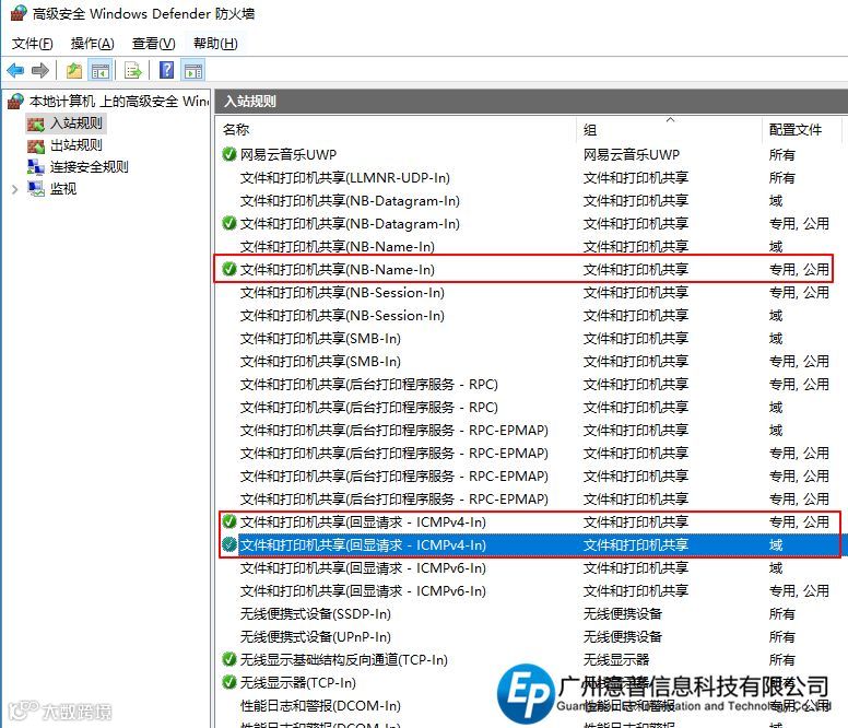 打开所有控制面板项—WindowsDefender防火墙—高级设置—入站规则,启动“文件和打印机共享(NB-Name-In)”和“文件和打印机共享(回显请求 - ICMPv4-In)”,都选“配置文件为专用,公用”,如图3所示