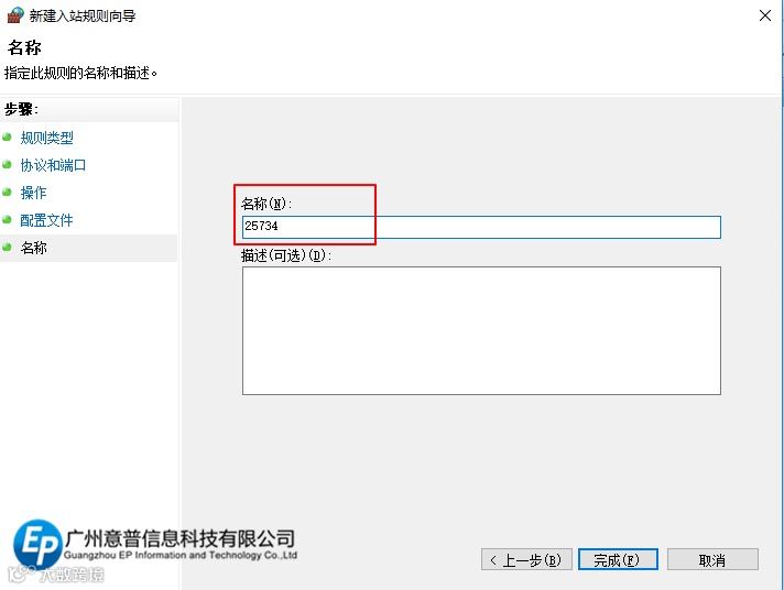 后续的默认下点“下一步”两次直到输入名称选项,输入“25734”。单击“完成”,如图8所示