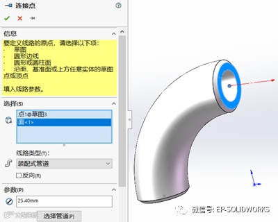 (注:这里的“路线”草图指的是扫描的轮廓草图,这个轮廓草图的尺寸名称为“直径”,这个值在Routing里并没有起到与其它配件之间的识别作用,所以这个草图的命名不太重要)