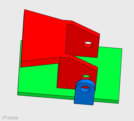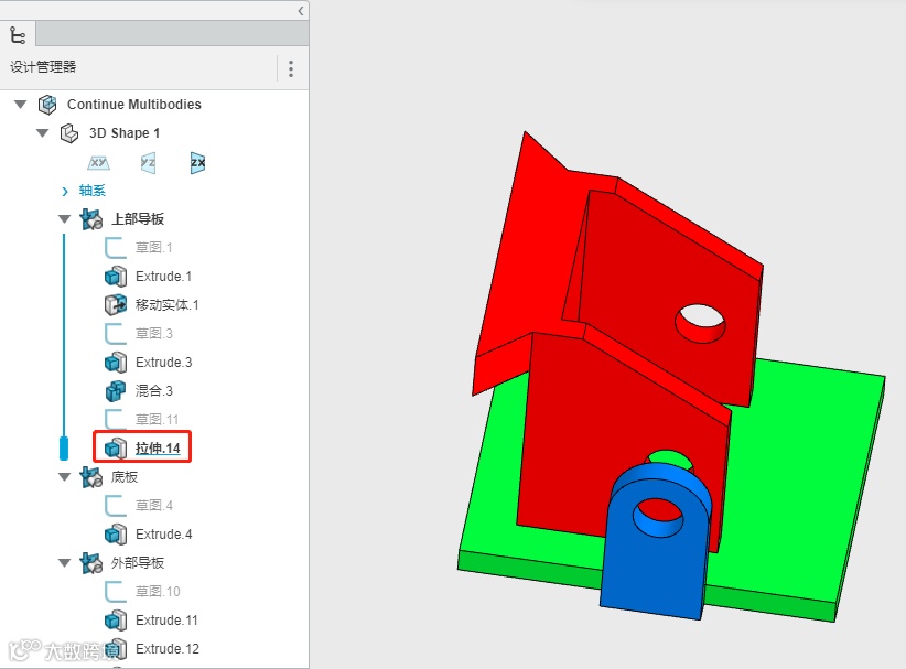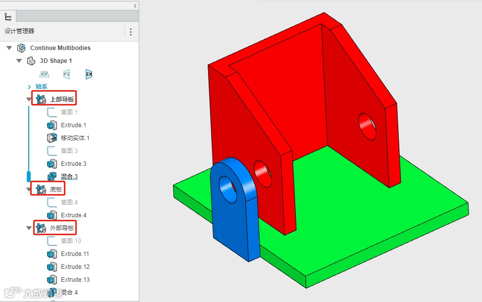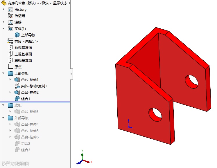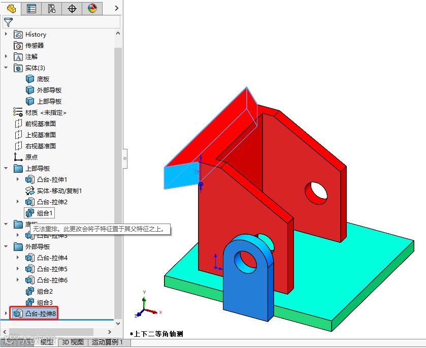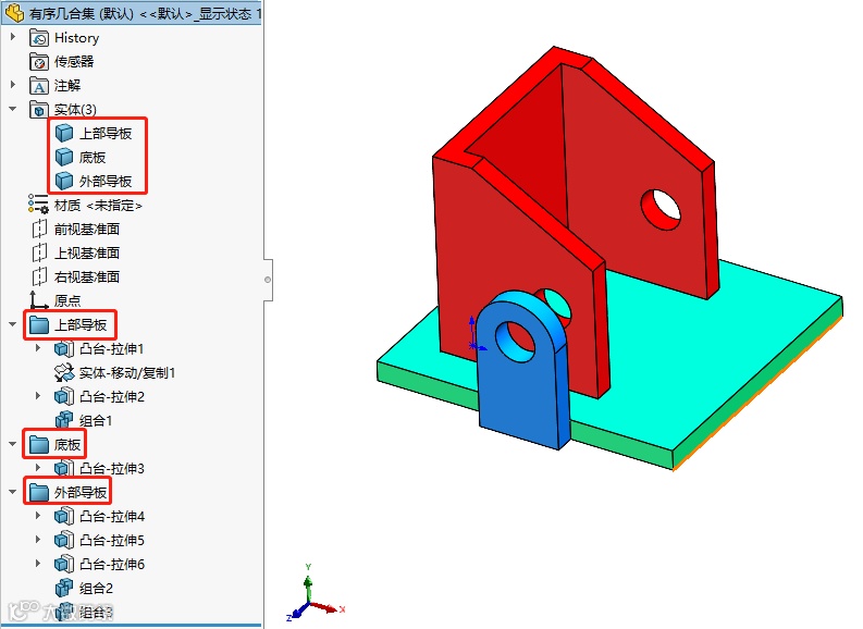 以下零件是用SOLIDWORKS绘制的,它由三个实体组成,包括红色的上部导板,绿色的底板和蓝色的外部导板,左侧的结构树,特征用文件夹分类。