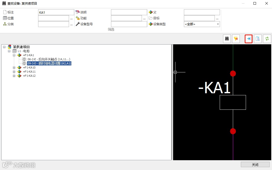 2、通过【搜索设备】、【进入图纸命令】,也能快速查找设备在图纸的位置,在图纸数量很多的大型项目下,尤其常用。如图1-2所示。