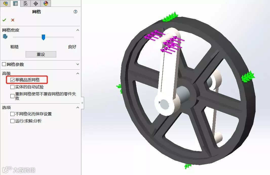 右键网格,在属性管理器里面展开高级。默认是高品质网格,当需要草稿品质的时候,勾选草稿品质网格选项。只是一个全局设置,勾选之后所有的实体都是草稿品质的。