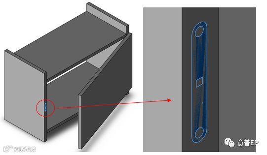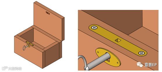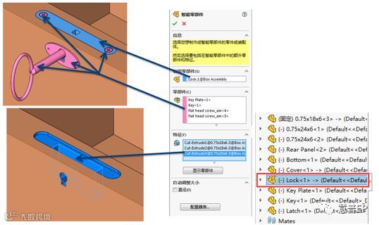 然后取箱子锁头的那部分零件来制作智能零部件,首先在当前装配体界面,打开【工具】——【制作智能零部件】这个功能,然后会在属性管理器中弹出【智能零部件】的参数定义界面。如图,按顺序在图形区域中点选几何体以定义智能零部件的参数,选择完成后确定,智能零部件就制作完成了。在设计树中可以看到零件符号多了一个闪电的标志,这就是智能零部件的符号。接下来应用这个智能零部件,打开需要装配这类锁头的另一个装配体并进行装配这个锁头智能零部件。