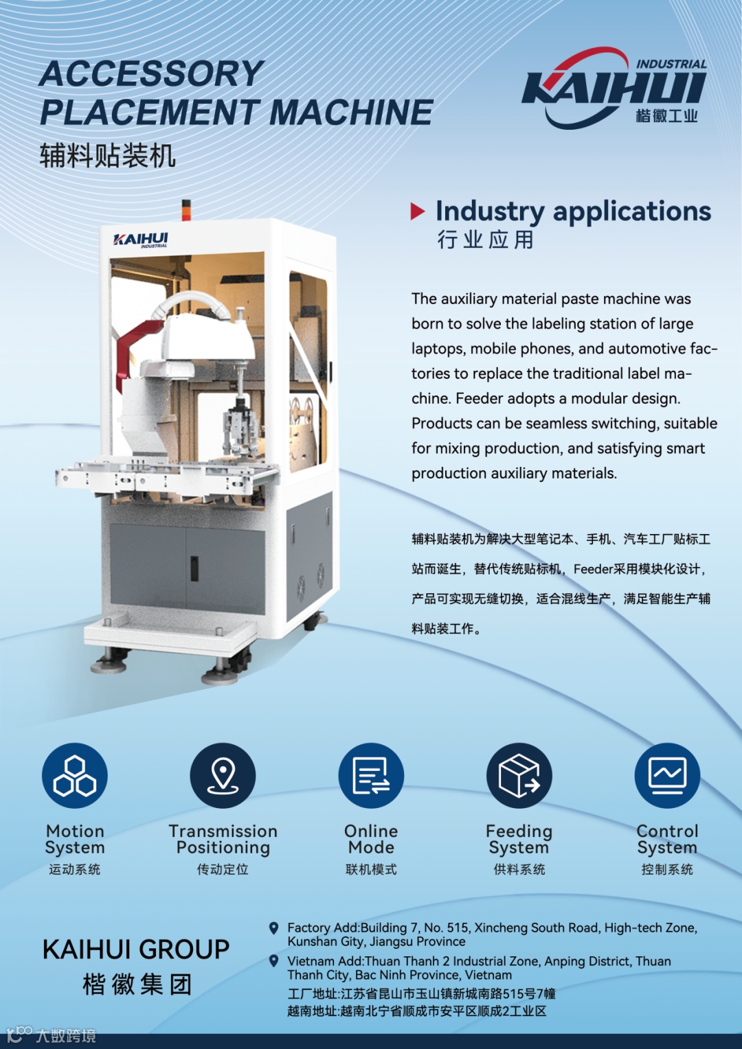 近年来,楷徽积极拓展海外市场,以持续的创新技术和高质量的产品,加速全球化战略步伐,积极构建全球化服务体系,现已成立7个海外服务据点,并于越南设立工厂,销售与服务网络辐射新加坡、越南、印度尼西亚、泰国、日本、墨西哥、巴西等国家,实现全球销售和服务覆盖。