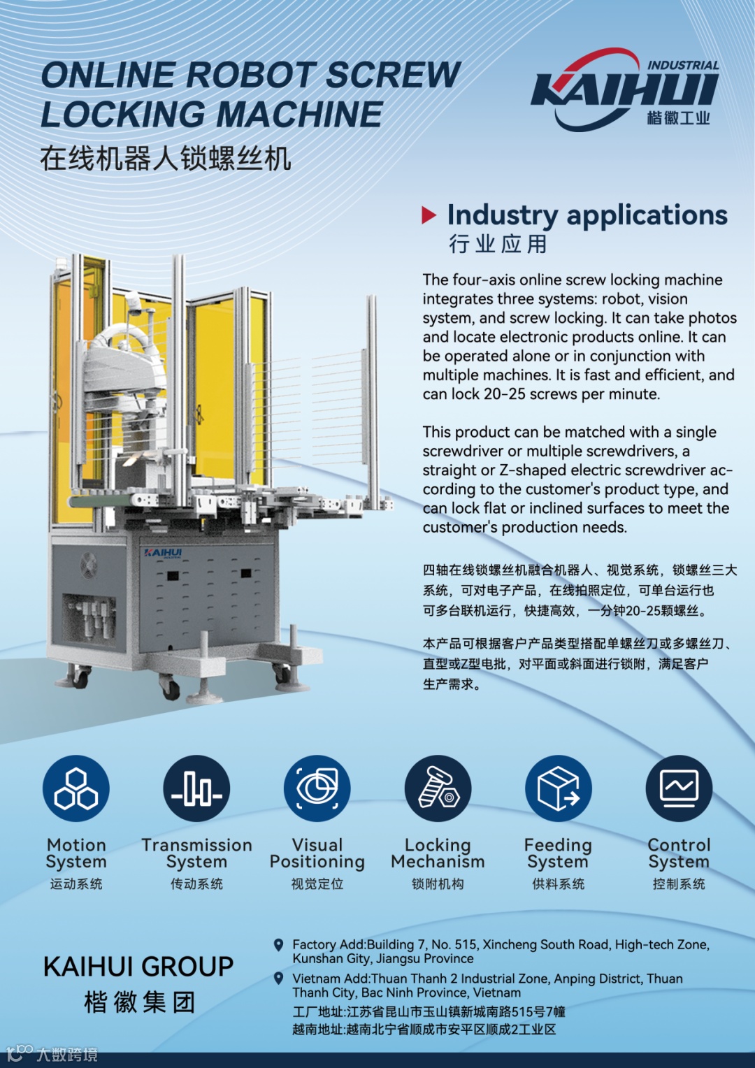 2006年,楷徽工业全面进入高端智能装备行业,公司集研发、生产、销售、服务为一体,拥有自主的电气和软件的开发能力,以及市场主流品牌机器人的整合能力,形成了几十项技术专利及认证,产品广泛应用于3C电子、家电、汽车、新能源等行业。