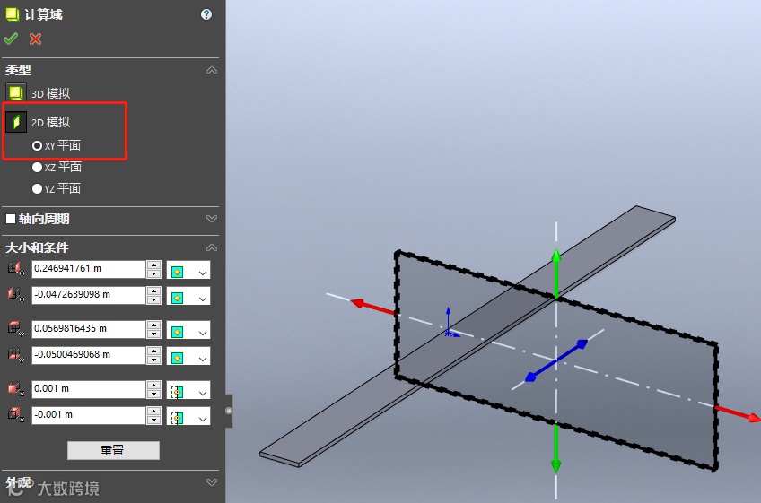 之后,SOLIDWORKS Flow Simulation自动为我们生成算例树,我们把计算域更改为2D平面,大致设置计算域大小,如下图: