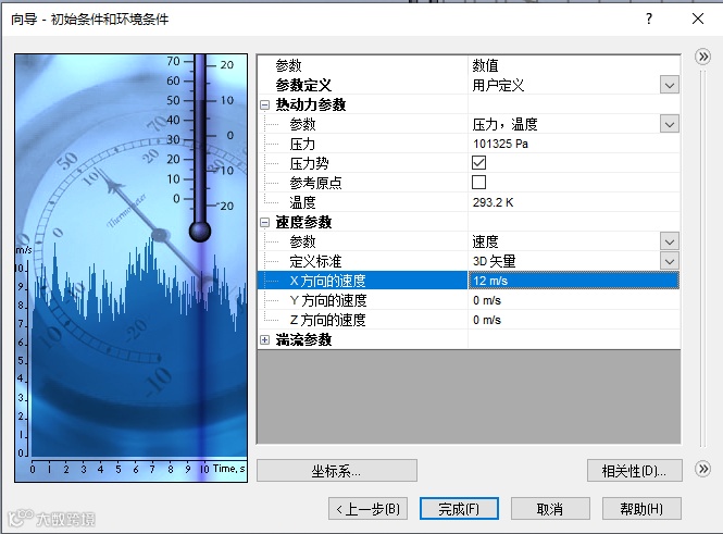 4)最后,初始条件我们选择X方向速度为12m/s,相当于6级风左右;