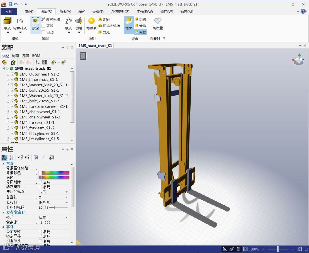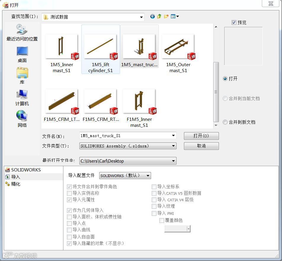 1、利用现有的3D CAD数据资源,SOLIDWORKS Composer直接读入SW文档。打开SOLIDWORKS Composer,选择导入配置文件“SOLIDWORKS(默认)”(图1),可以将文件合并到零件角色以及“导入零件的元属性”(图2),将3D CAD数据导入SOLIDWORKS Composer软件中。
