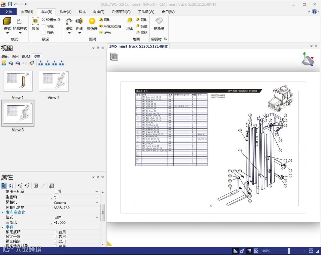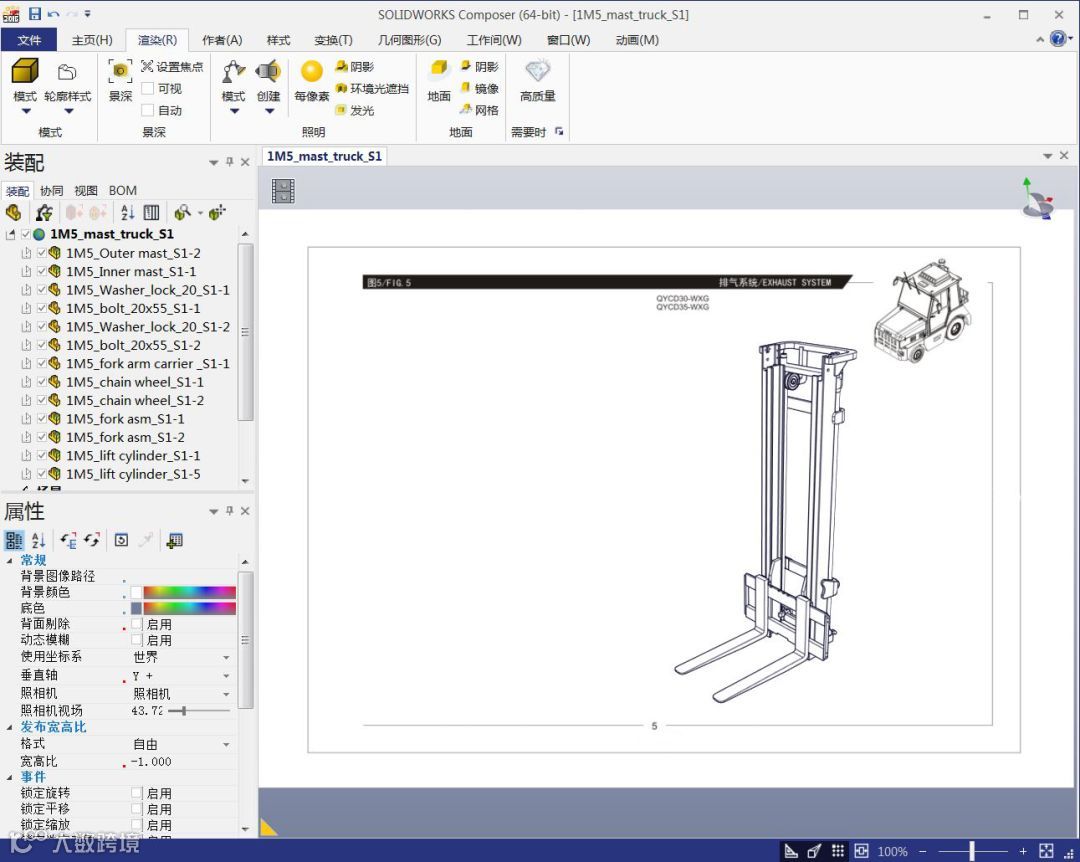 2、打开SOOLIDWORKS原文件以后,首先通过“渲染/模式”—轮廓渲染,把模型原有渲染的颜色切换成线稿模样式。然后为了符合产品手册的纸张大小,我们选择“作者/图像”插入对应图片。插入时,需要通过选择图片在“属性”选项“背景”勾起“启用”。同时选择“冻结”来锁定背景图片在以后操作中被无意选取。这时模型就可放置在图片对应的位置进行制作(图3)。