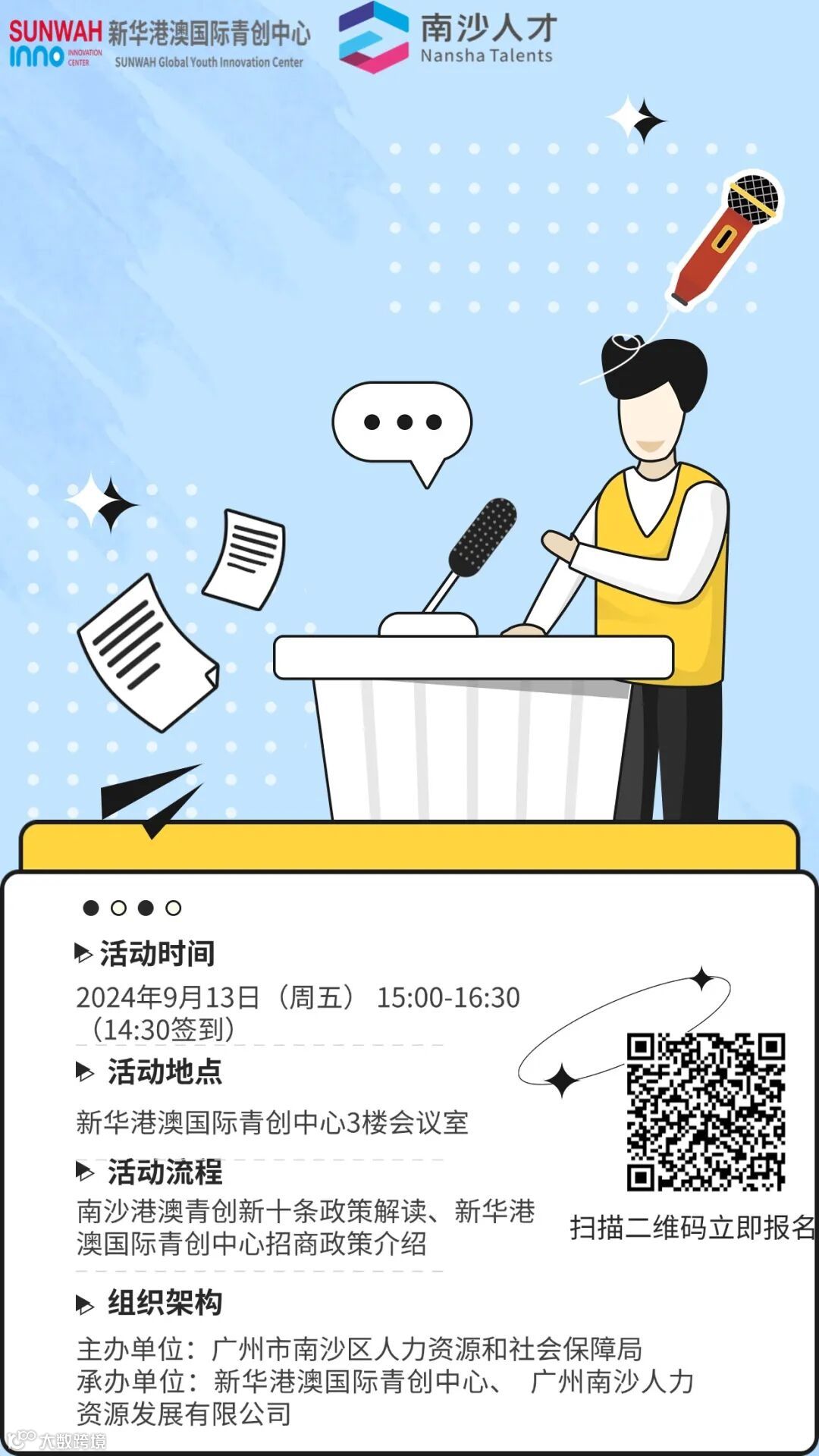 亲爱的青年朋友们,南沙港澳青创新十条政策涵盖实习、就业、创业等多方位,福利多多!利好补贴可不止以上内容!新华港澳国际青创中心携手南沙区人力资源和社会保障局、广州南沙人力资源发展有限公司,举办“南沙创新潮:政策引领下的创业新机遇”---2024年广州市南沙区“源来好创业”青年创业资源对接服务季暨政策宣讲活动!