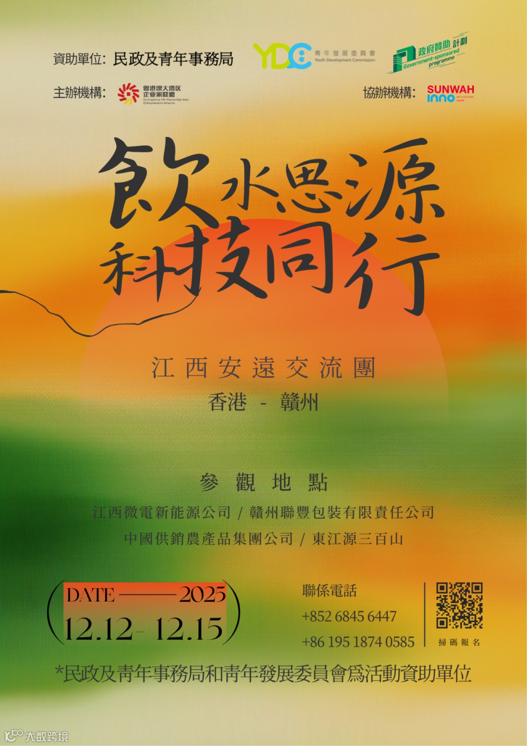 由香港青年發展委員會資助,粵港澳大灣區企業家聯盟主辦,新華港澳國際青創中心承辦的“飲水思源·科技同行”江西安遠交流團現正式面向香港青年開放報名!
