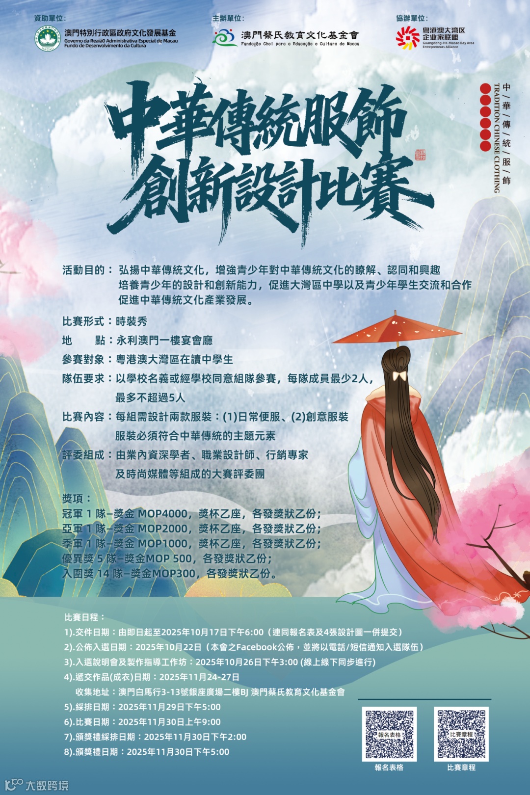 为弘扬中华传统文化,增强青少年对中华传统文化的了解、认同和兴趣,培养青少年的设计和创新能力,由澳门特别行政区政府文化发展基金资助,澳门蔡氏教育文化基金会主办,粤港澳大湾区企业家联盟协办,新华港澳国际青年创中心支持的"中华传统服饰创新设计大赛"正式开启报名通道!