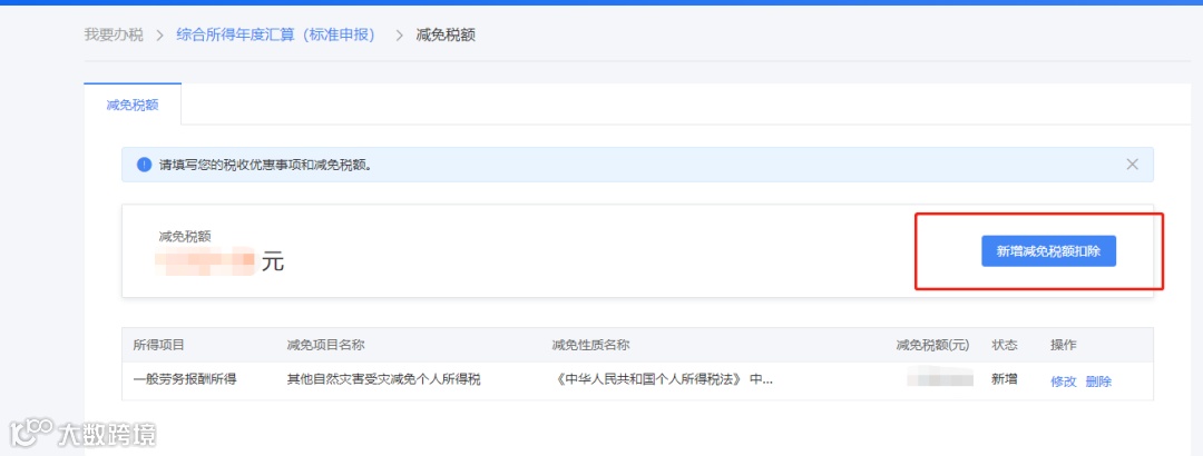 进入自然人电子税务局进行汇算清缴正式申报,在【税款计算】界面下找到【减免税额】栏次,点击右侧的【修改】进入减免税额填写界面。