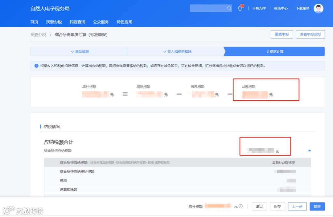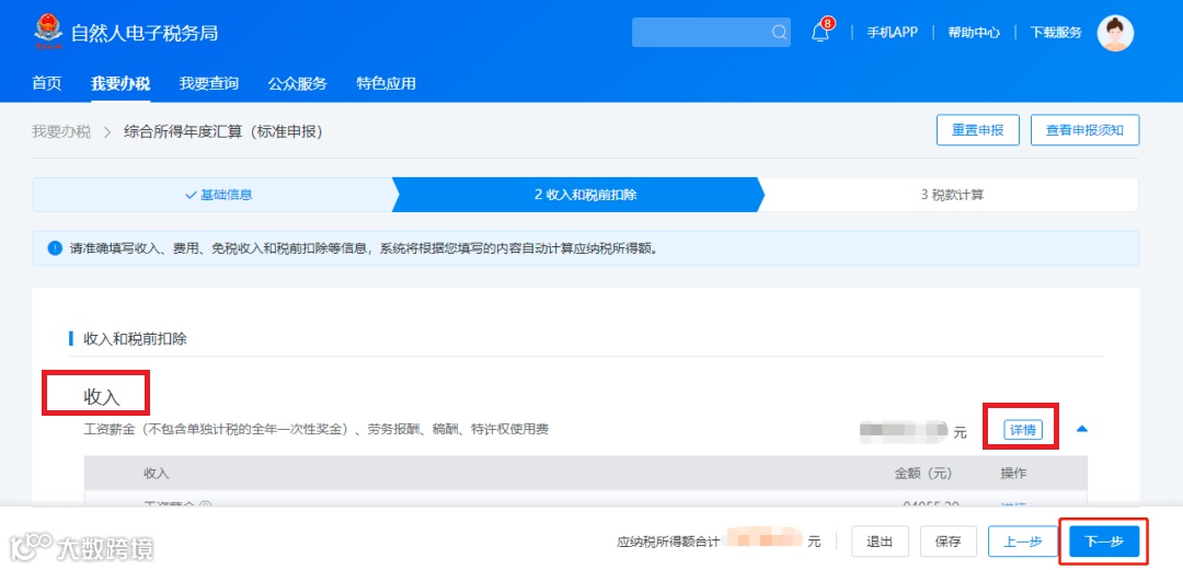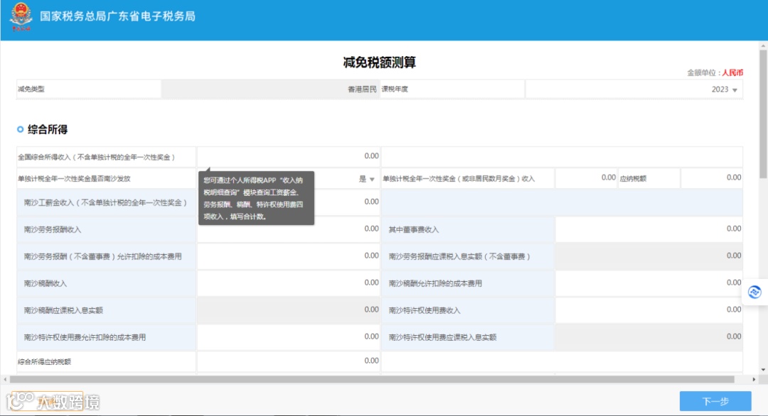 记录下系统带出的综合所得收入(包括境内综合所得总收入、南沙综合所得各项所得收入)、综合所得应纳税额、综合所得已缴税额(包括境内已缴税额、南沙已缴税额)。