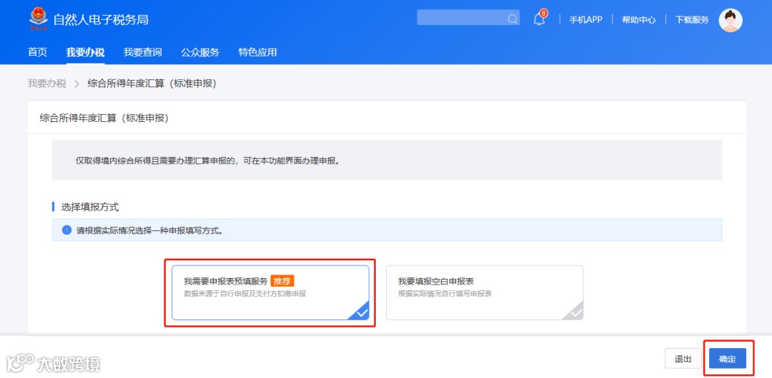 选择申报年度为【2023】,并点击右下方的【确定】继续选择申报方式,建议选择【我要申报表预填服务】。点击【确定】进入报表(以申报表预填为例)。