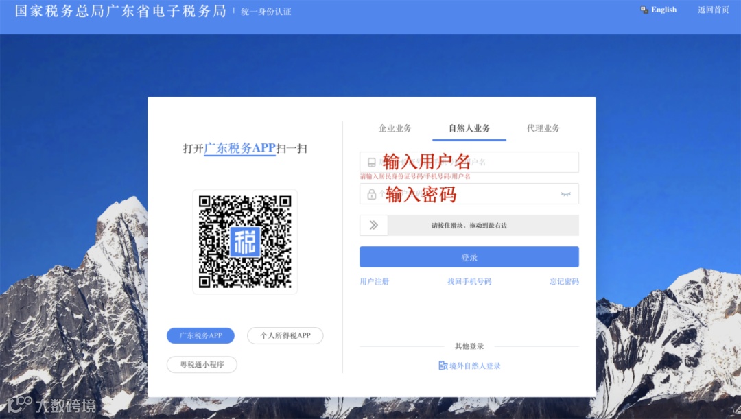 进入广东省电子税务局登录界面,选择自然人业务,输入账号密码登陆。