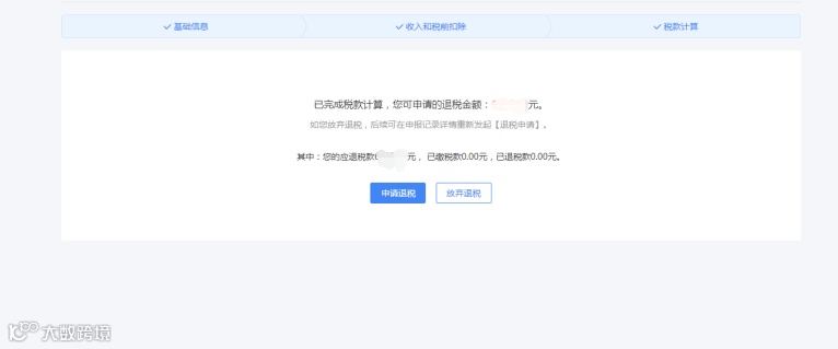 此时申报表已填写完成,确认无误后点击右下角【提交】按钮,完成申报。并根据页面提示进行【申请退税】或【立即缴款】。