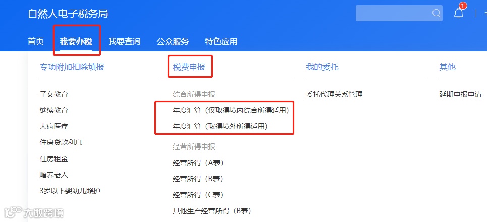 登录系统后,点击【我要办税】,选择【年度汇算(仅取得境内综合所得适用)】或者【年度汇算(取得境外所得适用)】。