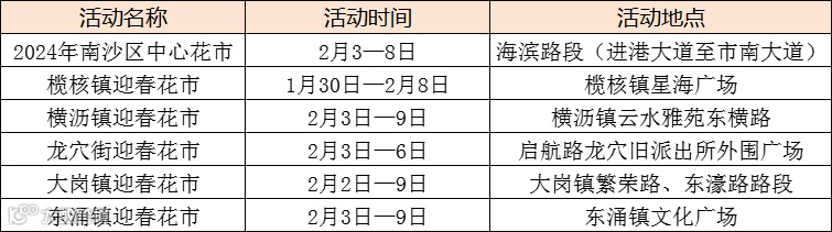 此外,榄核、横沥、龙穴、大岗、东涌等镇街亦将举办迎春花市,各位市民可逛花街挑选心仪的年花装点好心情。
