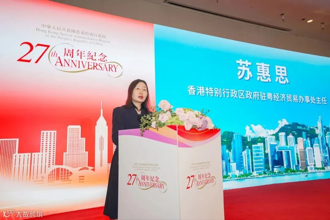 驻粤办主任苏惠思致辞时表示,今年是中华人民共和国成立75周年,也是香港回归祖国27周年。凭借中央政府的坚定支持,香港在回归祖国以后一直发挥在“一国两制”下“背靠祖国、联通世界”的独特优势。香港是全球顶尖国际金融中心之一,是亚太区主要国际法律及争议解决服务中心,是自由港,也是国际航空枢纽以及航运中心。