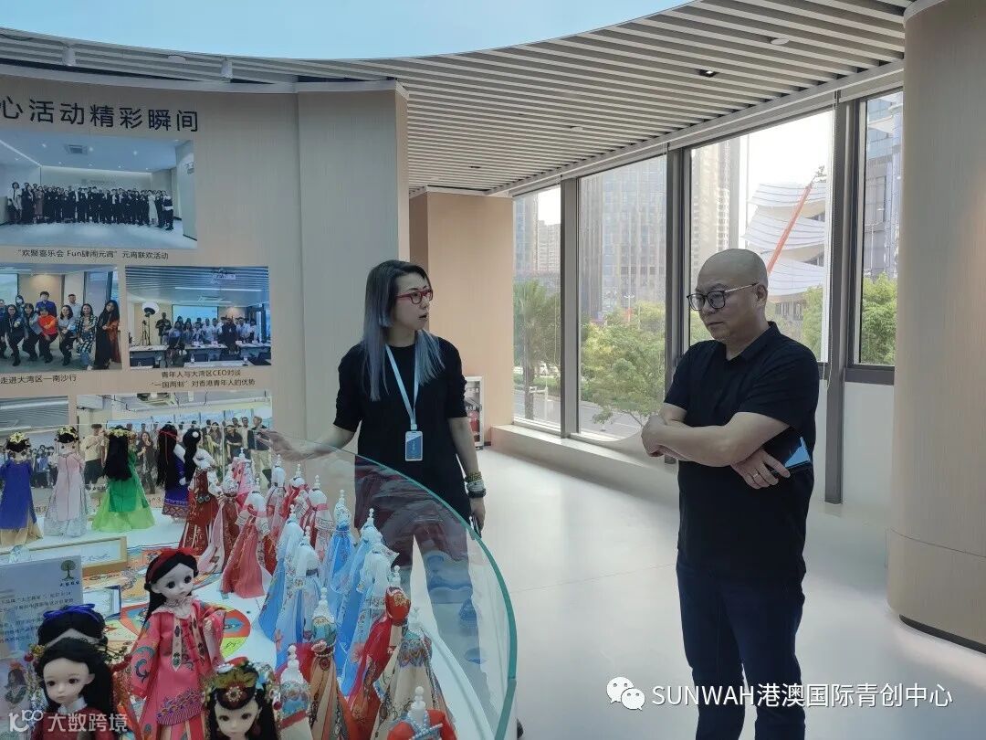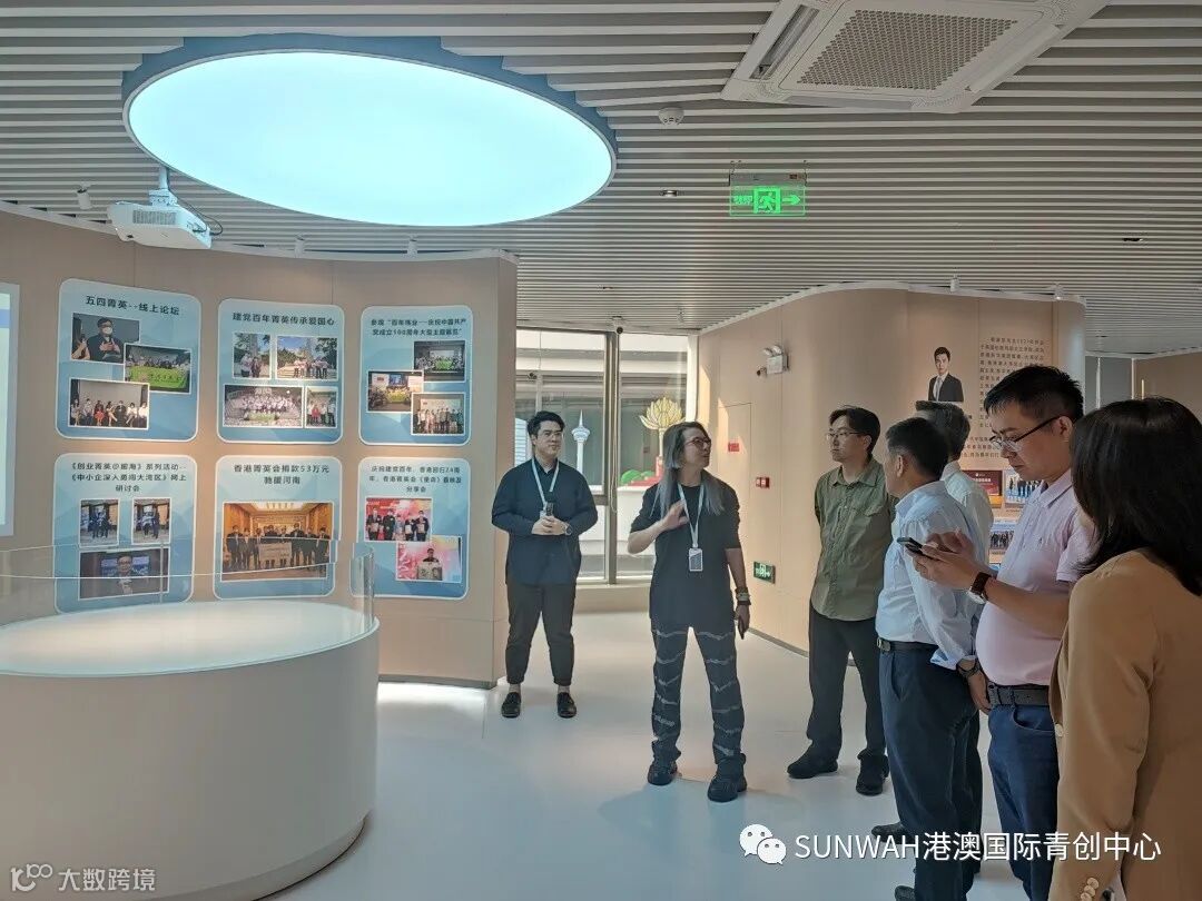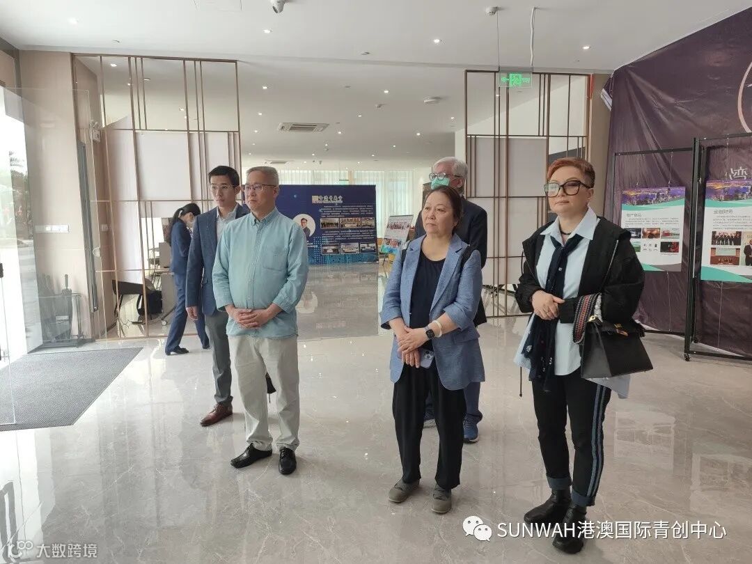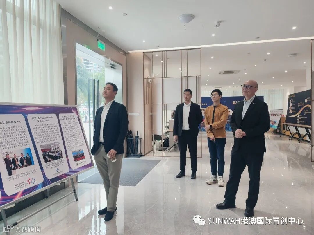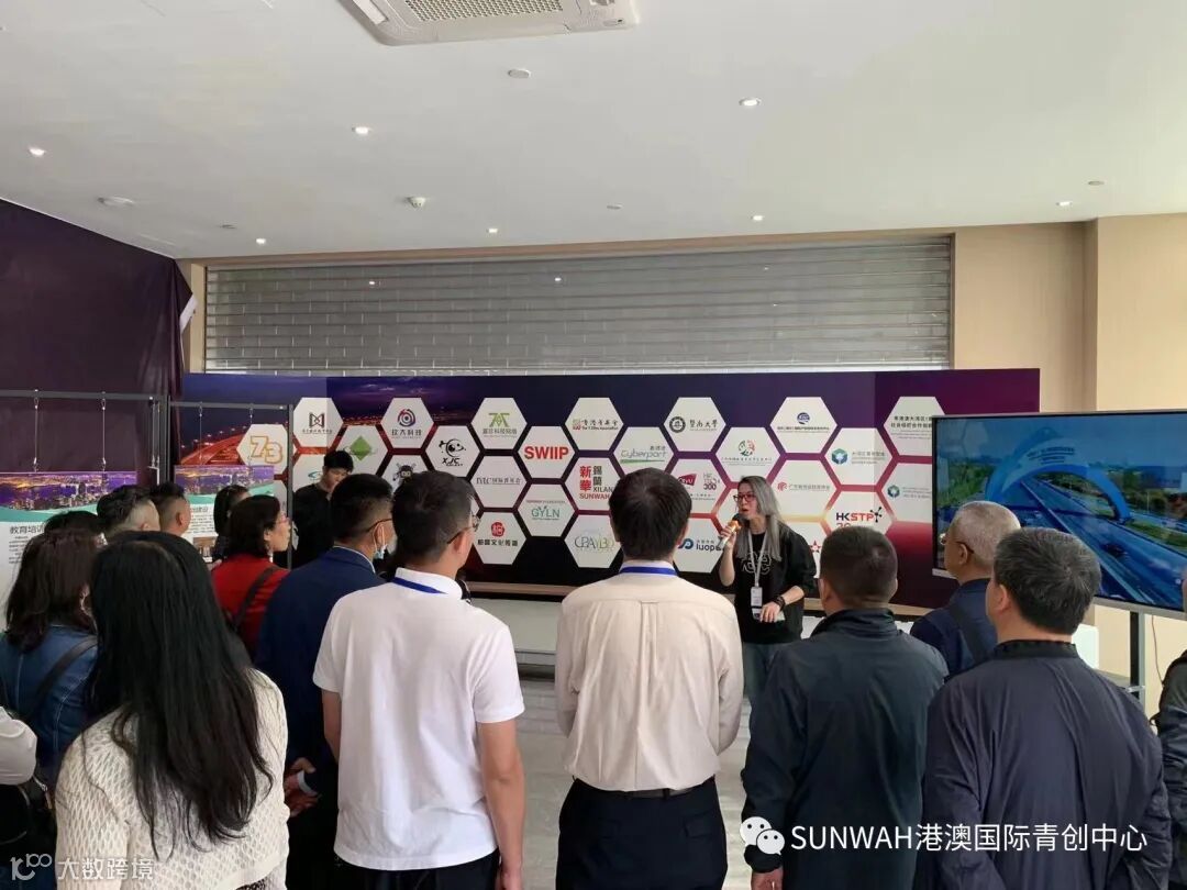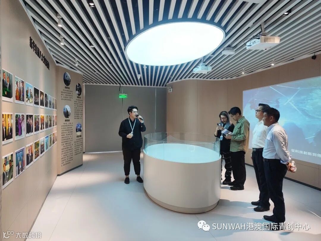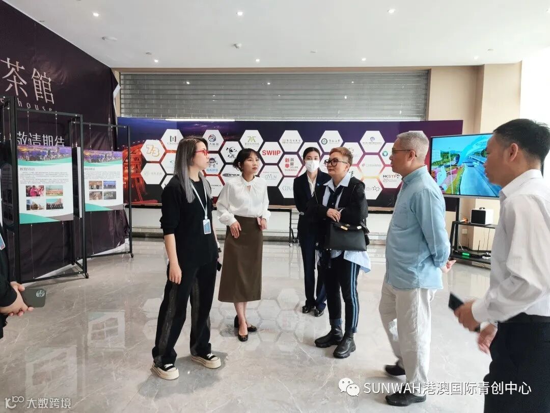 香港华懋集团一行到访中心参观交流,中心负责人蔡总陪同众人参观展厅,向各位介绍了中心的创立理念、集团资源的导入,致力帮助更多港澳创新创业青年立足南沙、协同港澳、面向全球。