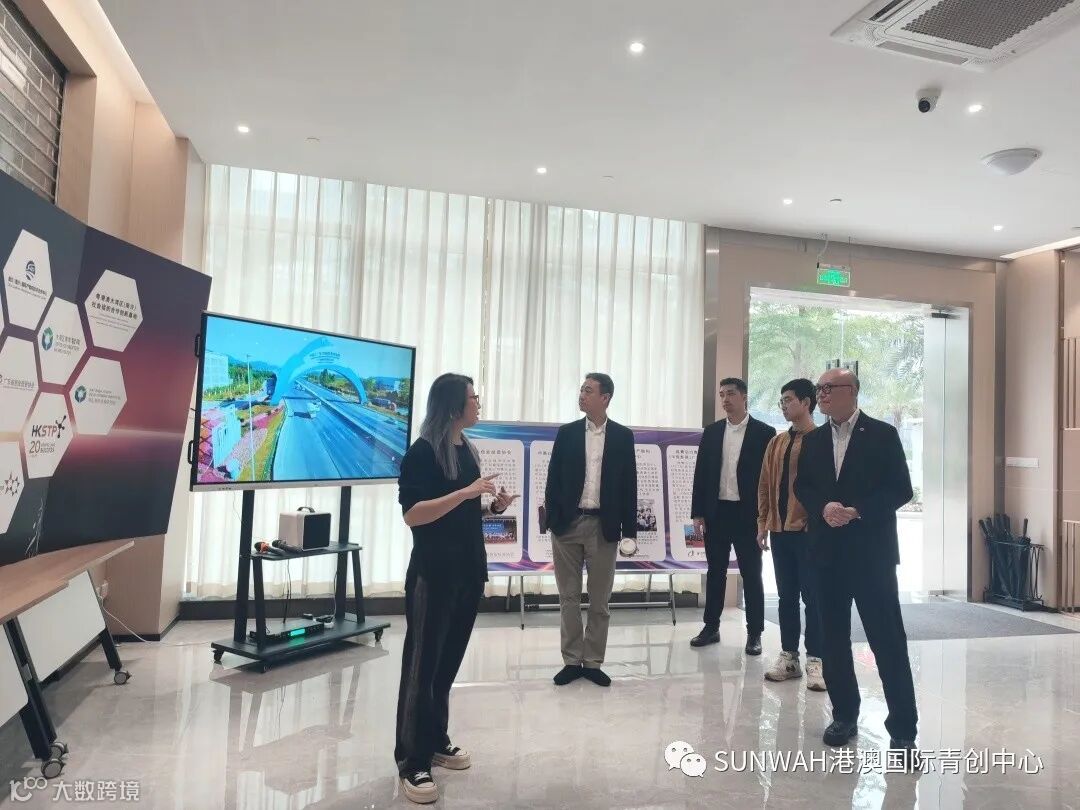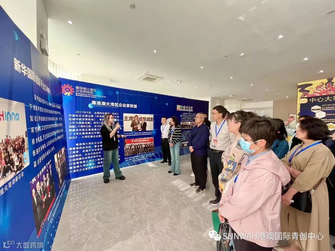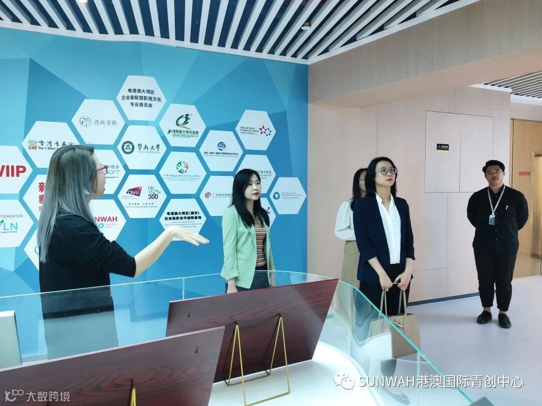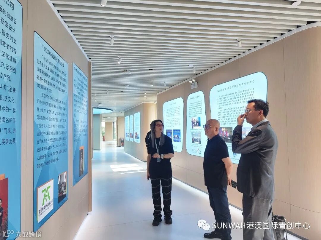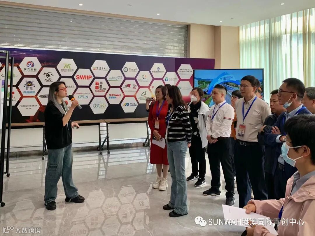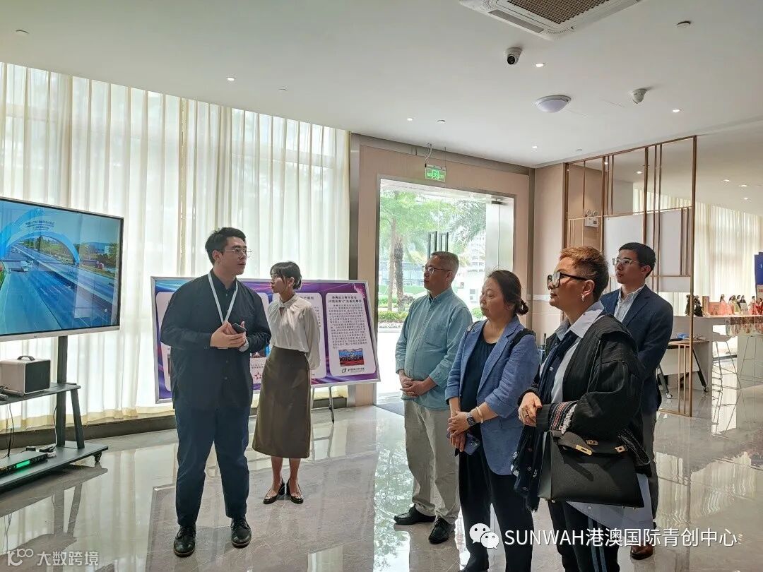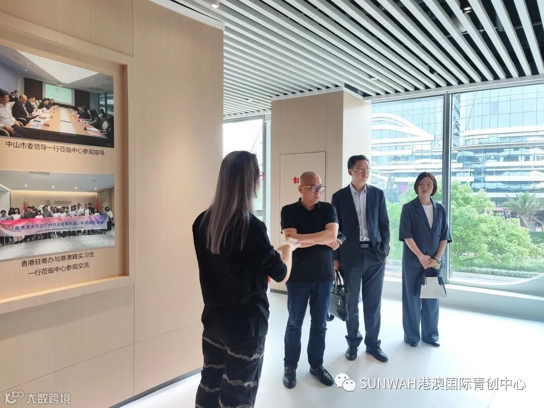 香港华懋集团一行到访中心参观交流,中心负责人蔡总陪同众人参观展厅,向各位介绍了中心的创立理念、集团资源的导入,致力帮助更多港澳创新创业青年立足南沙、协同港澳、面向全球。