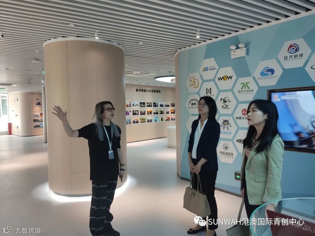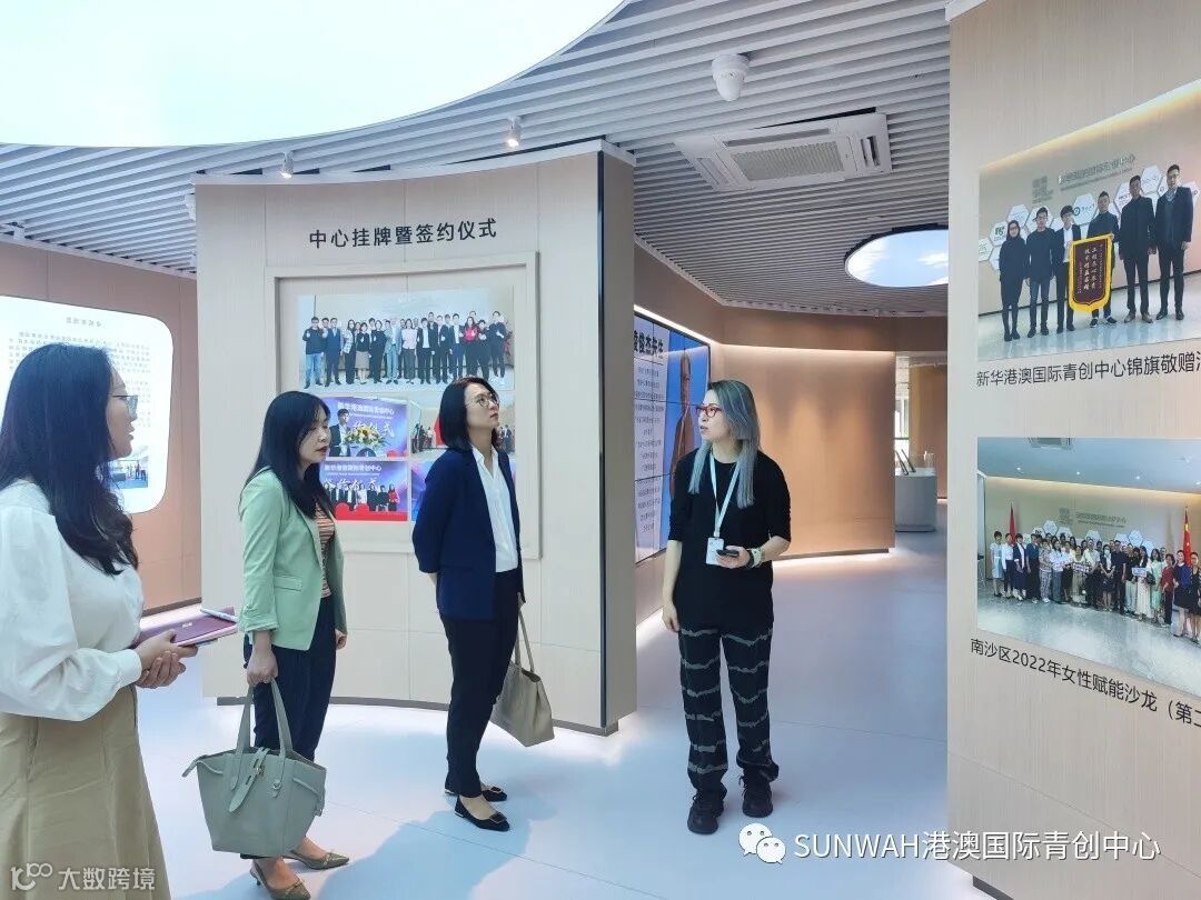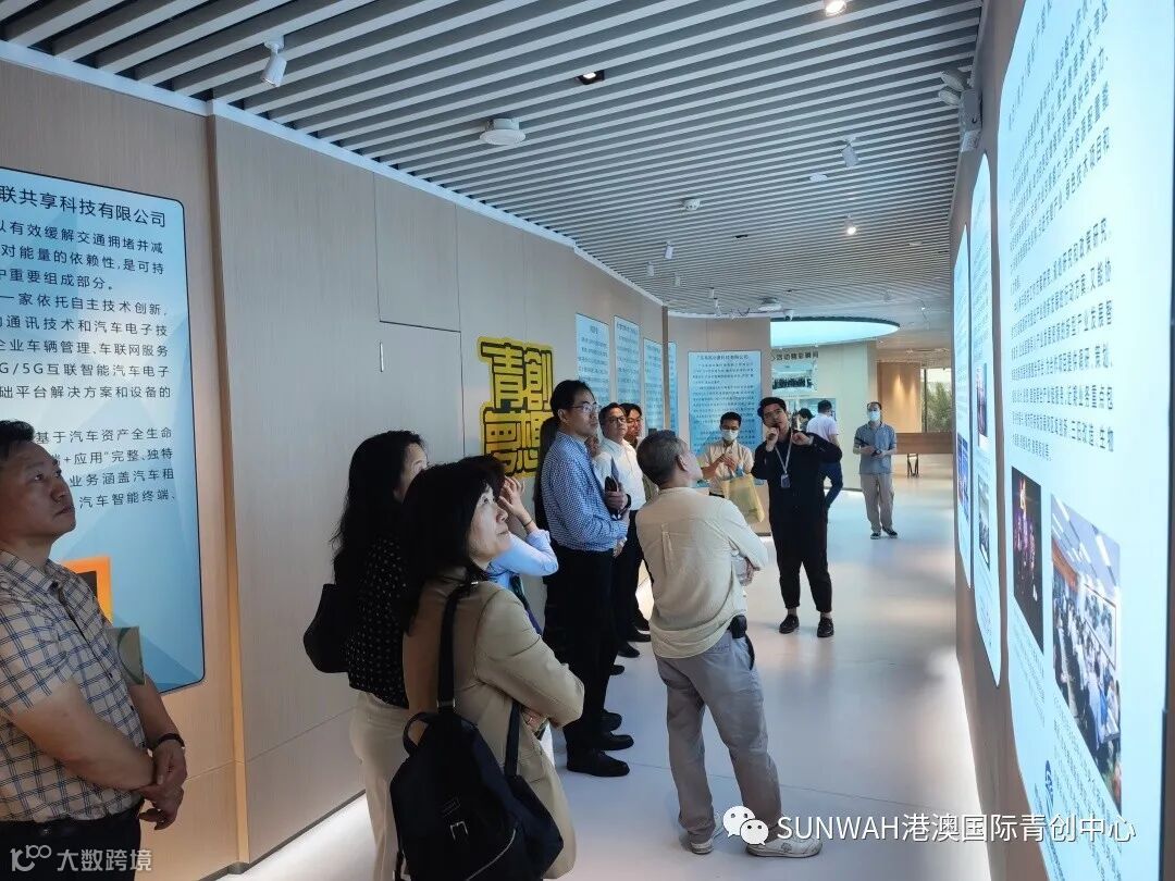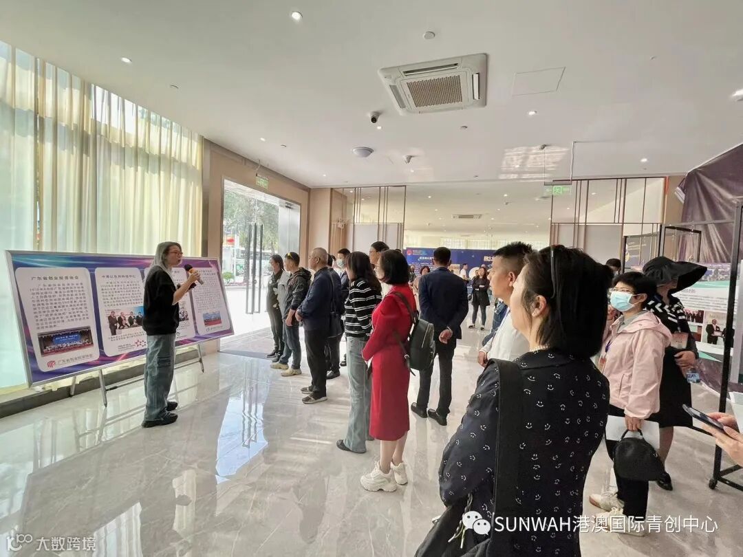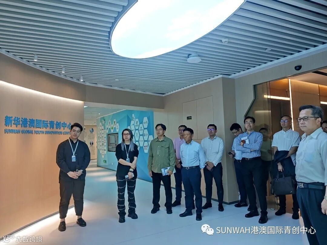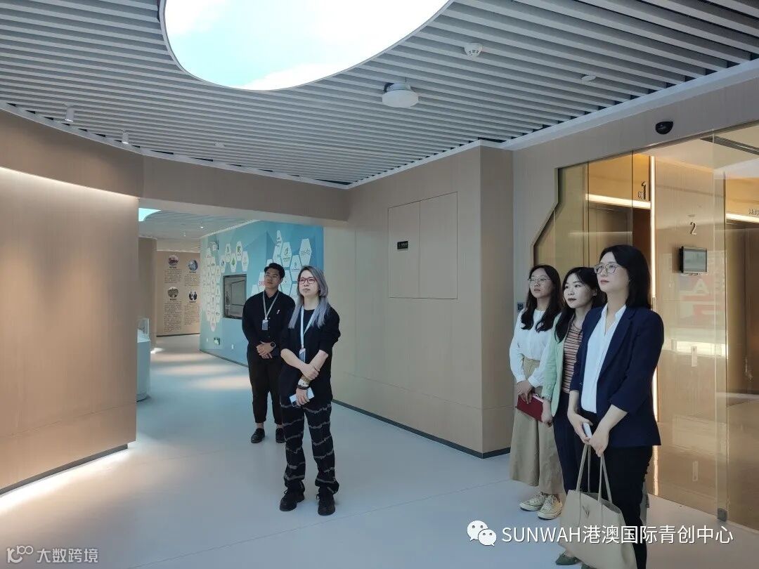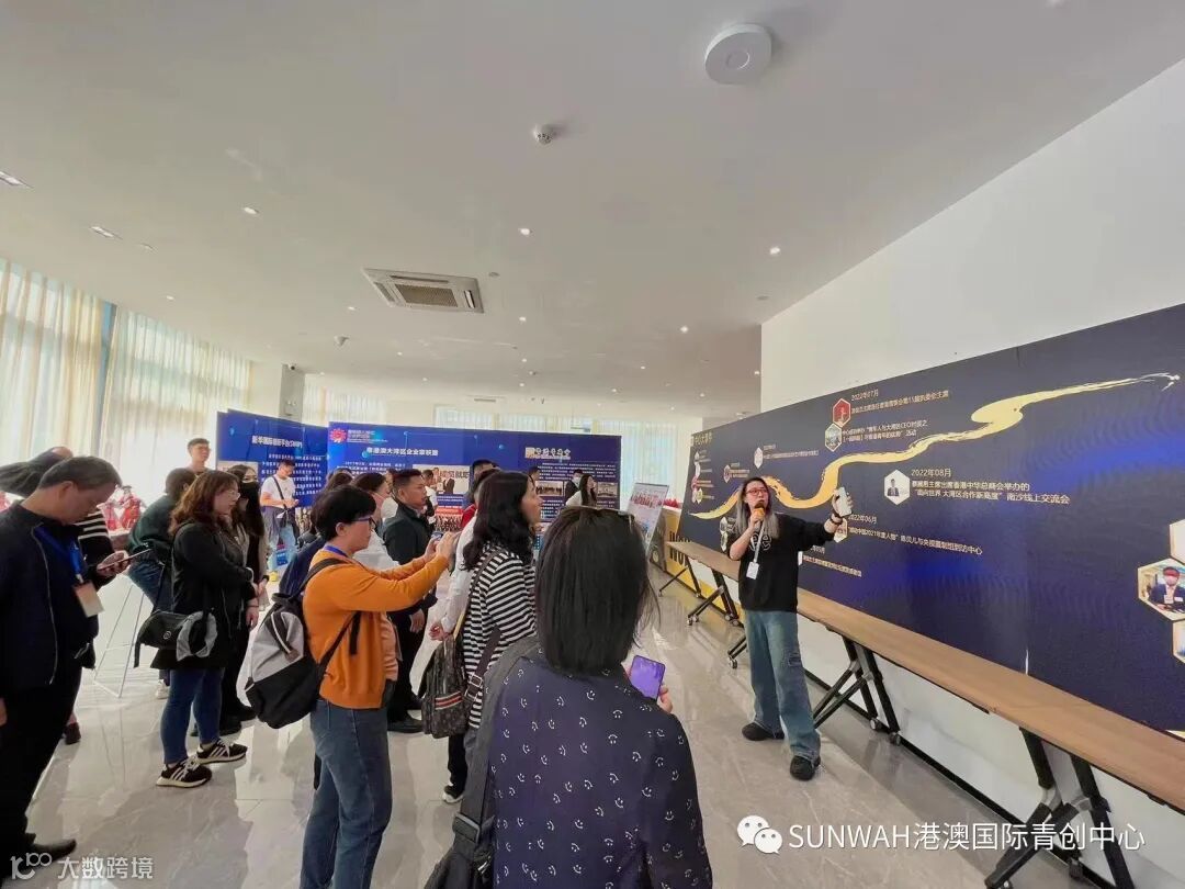 香港华懋集团一行到访中心参观交流,中心负责人蔡总陪同众人参观展厅,向各位介绍了中心的创立理念、集团资源的导入,致力帮助更多港澳创新创业青年立足南沙、协同港澳、面向全球。