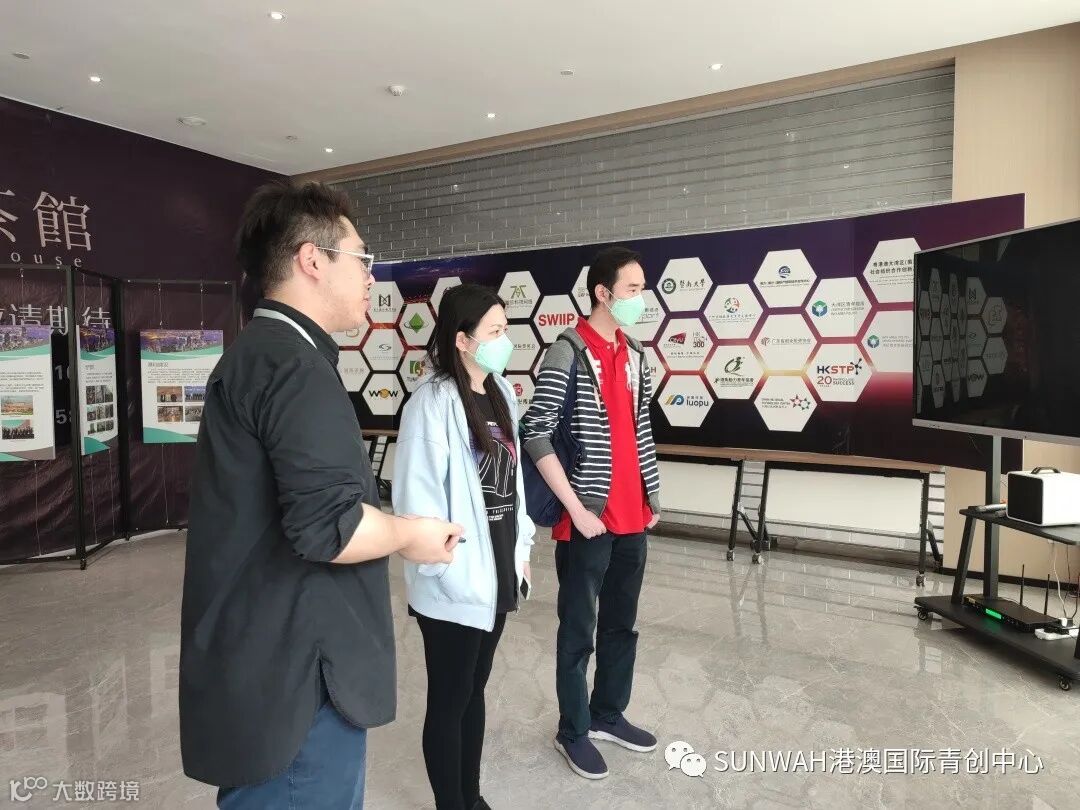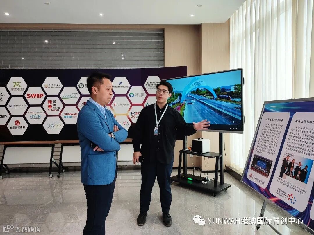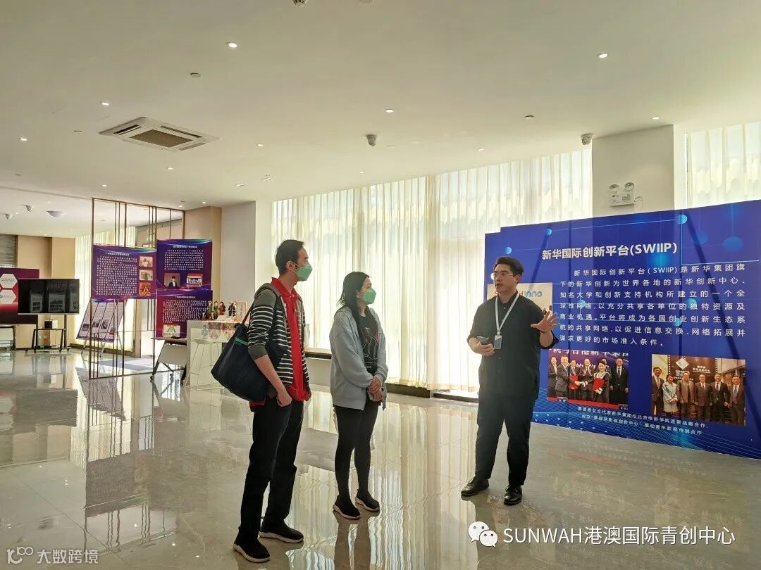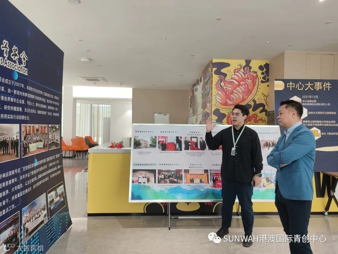 香港创业青年一行到访中心参观交流,中心工作人员陪同二位参观展厅,并为众人详细介绍了中心内部资源、项目对接及资源导入的优势项目。