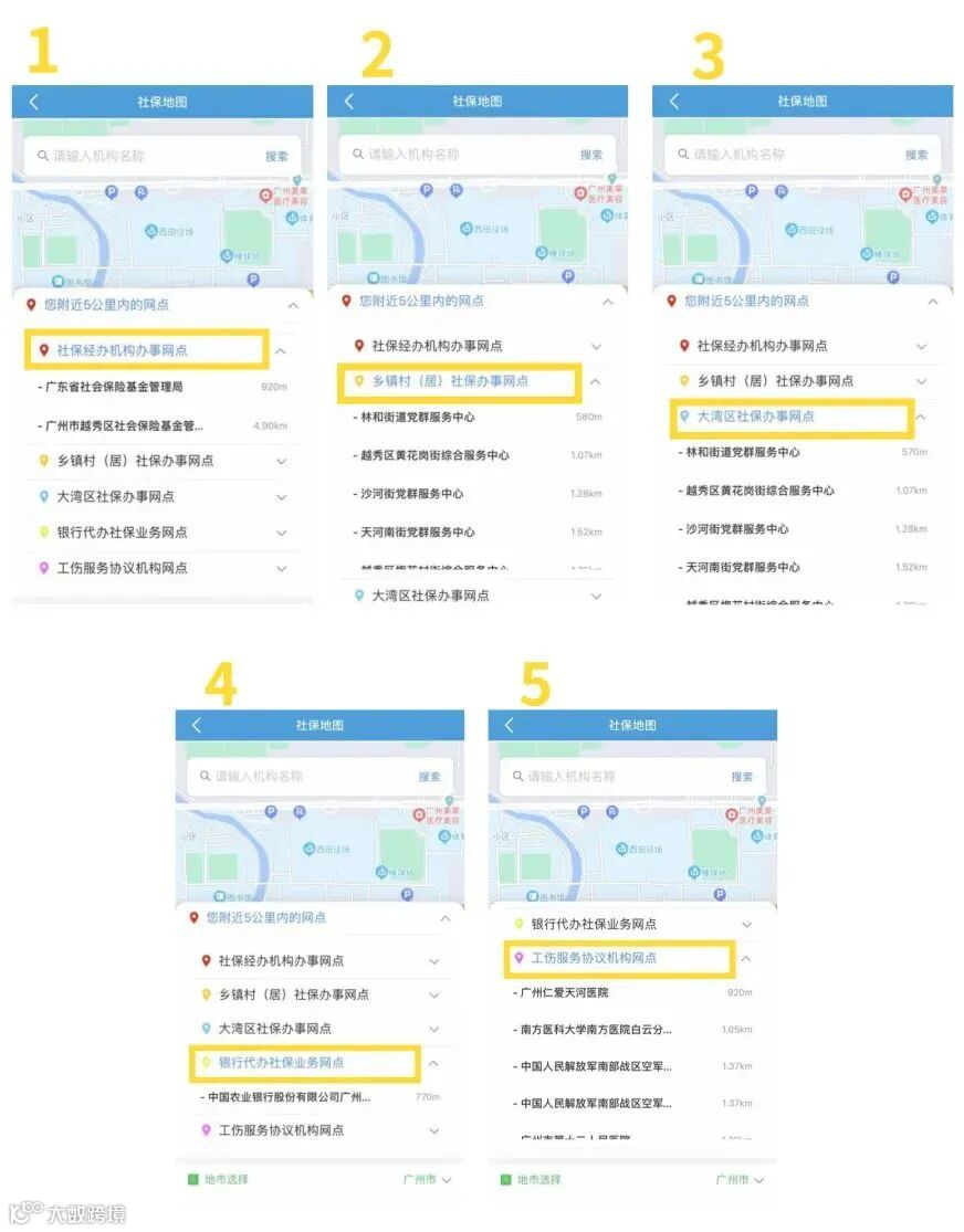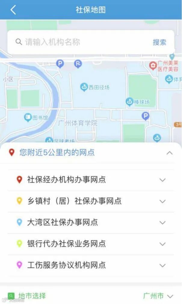 为方便办事群众第一时间找到附近社保服务网点,“社保电子地图”按功能分区展示网点信息。登录“广东人社”APP,在便民服务模块打开“社保电子地图”,马上就能根据手机的定位,显示附近5公里的所有社保服务网点。