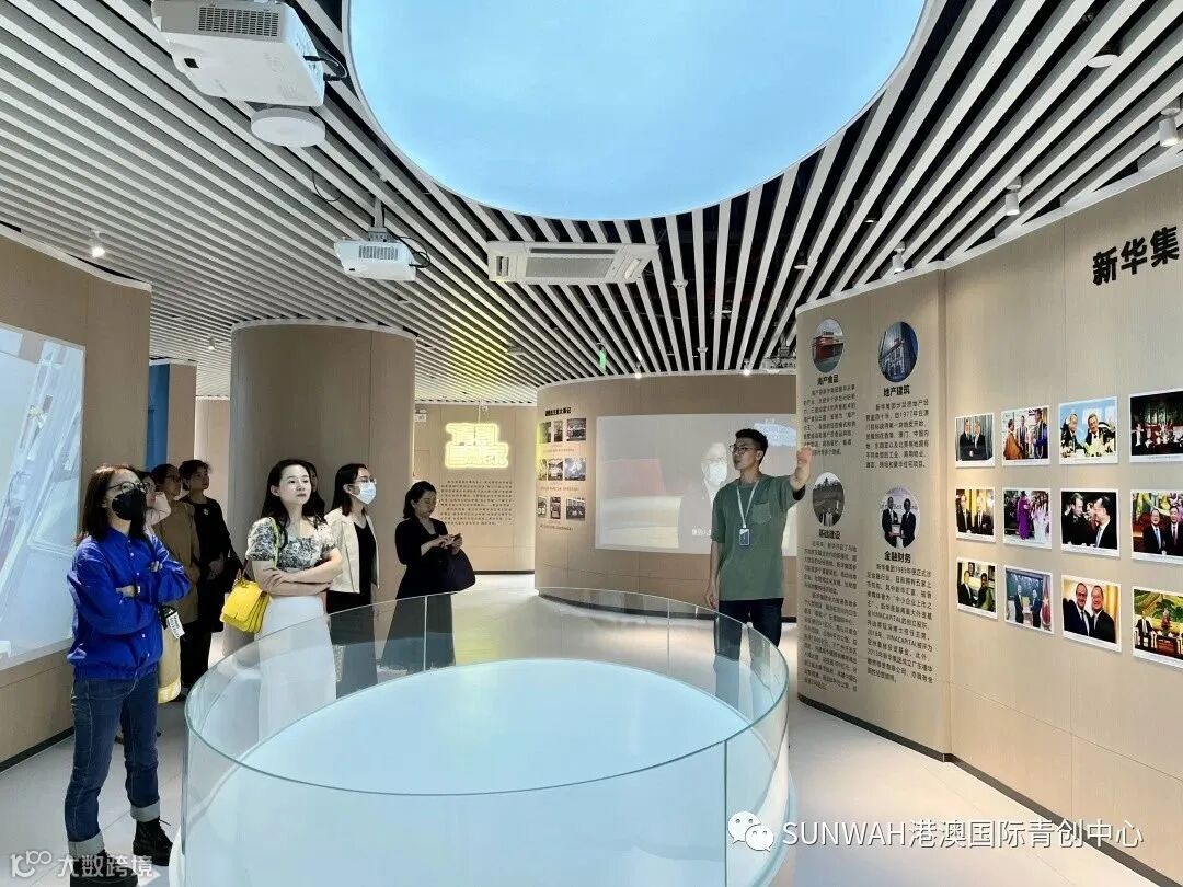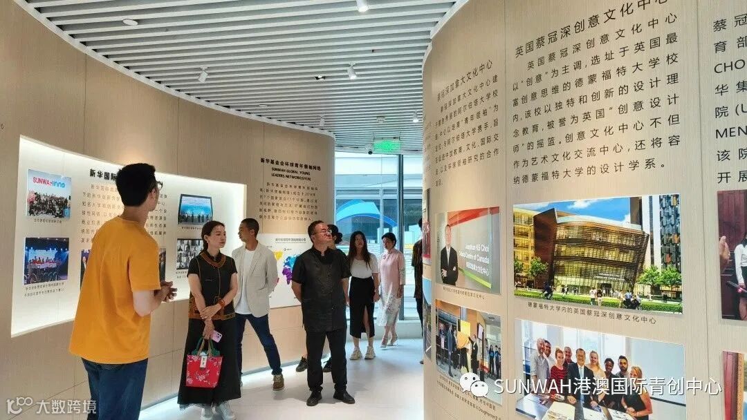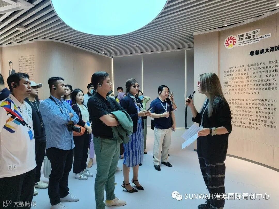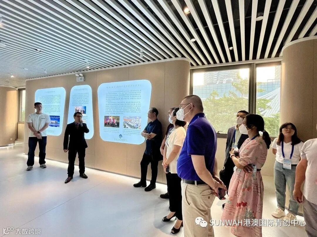 2023海外华媒看广东到访团一行莅临中心参观交流,中心工作人员陪同众人参观展厅,详细介绍了中心当前的运营规划、对接资源及入驻项目发展情况。入驻本中心的香港创业青年蔡玉鹏也对访问团进行项目分享。