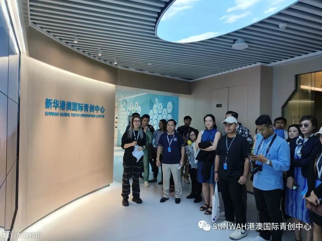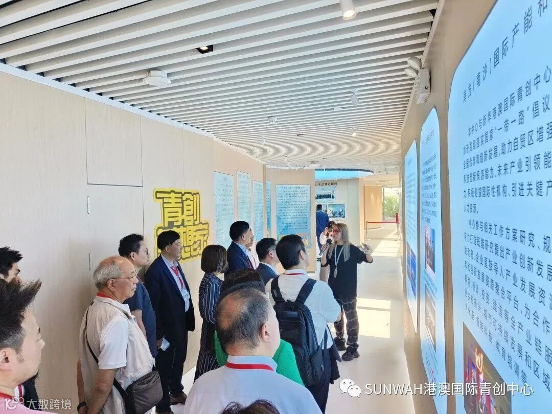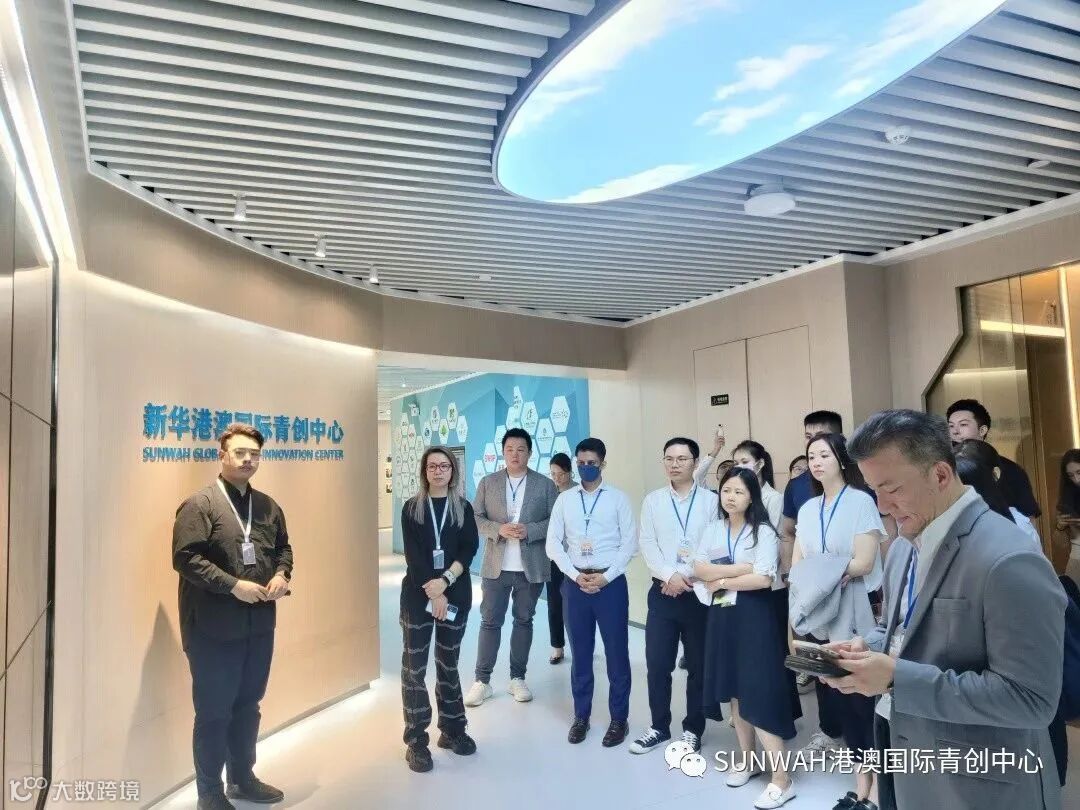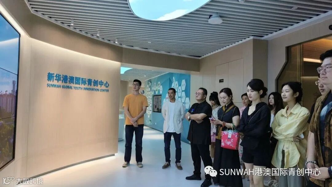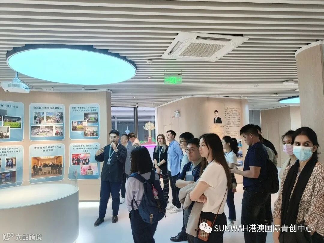 2023海外华媒看广东到访团一行莅临中心参观交流,中心工作人员陪同众人参观展厅,详细介绍了中心当前的运营规划、对接资源及入驻项目发展情况。入驻本中心的香港创业青年蔡玉鹏也对访问团进行项目分享。