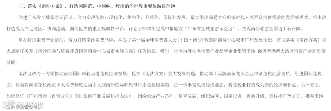 其中,单独一章提出:落实《南沙方案》,打造国际范、中国味、岭南韵的世界重要旅游目的地。